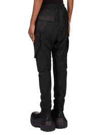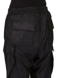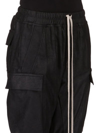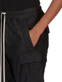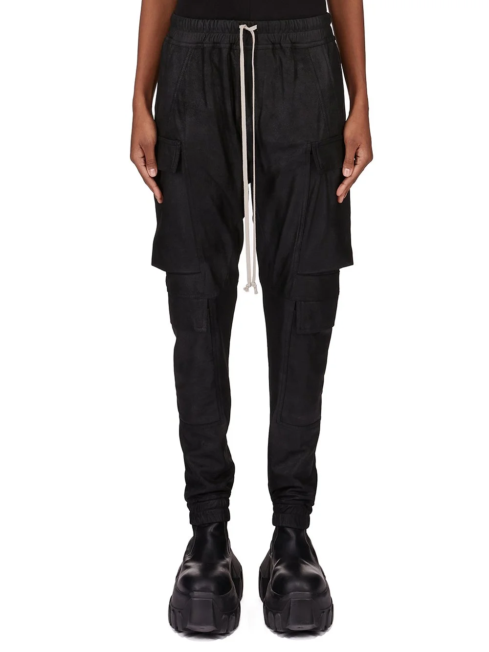 RICK OWENS FW25 CONCORDIANS MASTODON MEGACARGO IN BLACK BLISTER LAMB LEATHER THESE MASTODON MEGACARGO PANTS ARE FULL LENGTH WITH A SLIM FIT AND AN ELASTICIZED WAIST WITH DRAWSTRING AND ELASTICATED ANKLES. THEY FEATURE TWO SQUARE CARGO POCKETS ON THE THIGH, WITH TWO BEVELED CARGO POCKETS BELOW, AND TWO SQUARE BACK POCKETS, ALL HAVE FLAPS WITH HOOK AND LOOP FASTENINGS AND TOPSTITCHING.u THIS LIGHTWEIGHT LAMB LEATHER HAS AN EXAGGERATED, UNEVEN BLISTERED TEXTURE AND A SOFT, FLUID HANDFEEL. THE BLISTERED TEXTURE IS ACHIEVED BY EXAGGERATING THE NATURAL GRAIN TEXTURE OF EACH SKIN, THEREFORE THE LOOK OF EACH SKIN IS UNIQUE THIS LEATHER IS MADE BY A THIRD GENERATION FAMILY OWNED TANNERY IN THE SOUTH OF ITALY COLOR: BLACK MATERIAL: 100% LAMB LEATHER LINING 94% CUPRO + 6% ELASTANE BUTTONS 100% BUFFALO HORN MODEL IS 181CM TALL MODEL WEARS SIZE 40