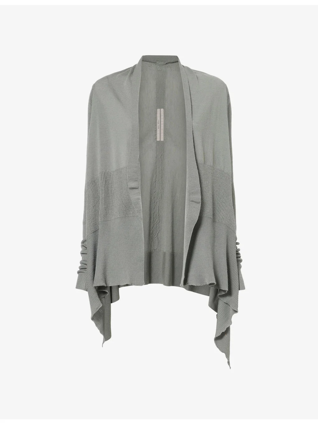 PRODUCT DETAILS - Rick Owens wool cardigan - 100% virgin wool - Regular fit, shawl collar, long sleeves, ribbed panels, all-over fine-knit pattern, asymmetric hem - Hand wash cold - Made in Italy - True to size - Size small: length 22in / 57cm - Model is 5ft 10in/1.78m and wears a size small - Midweight, stretchy Ref: R04583853