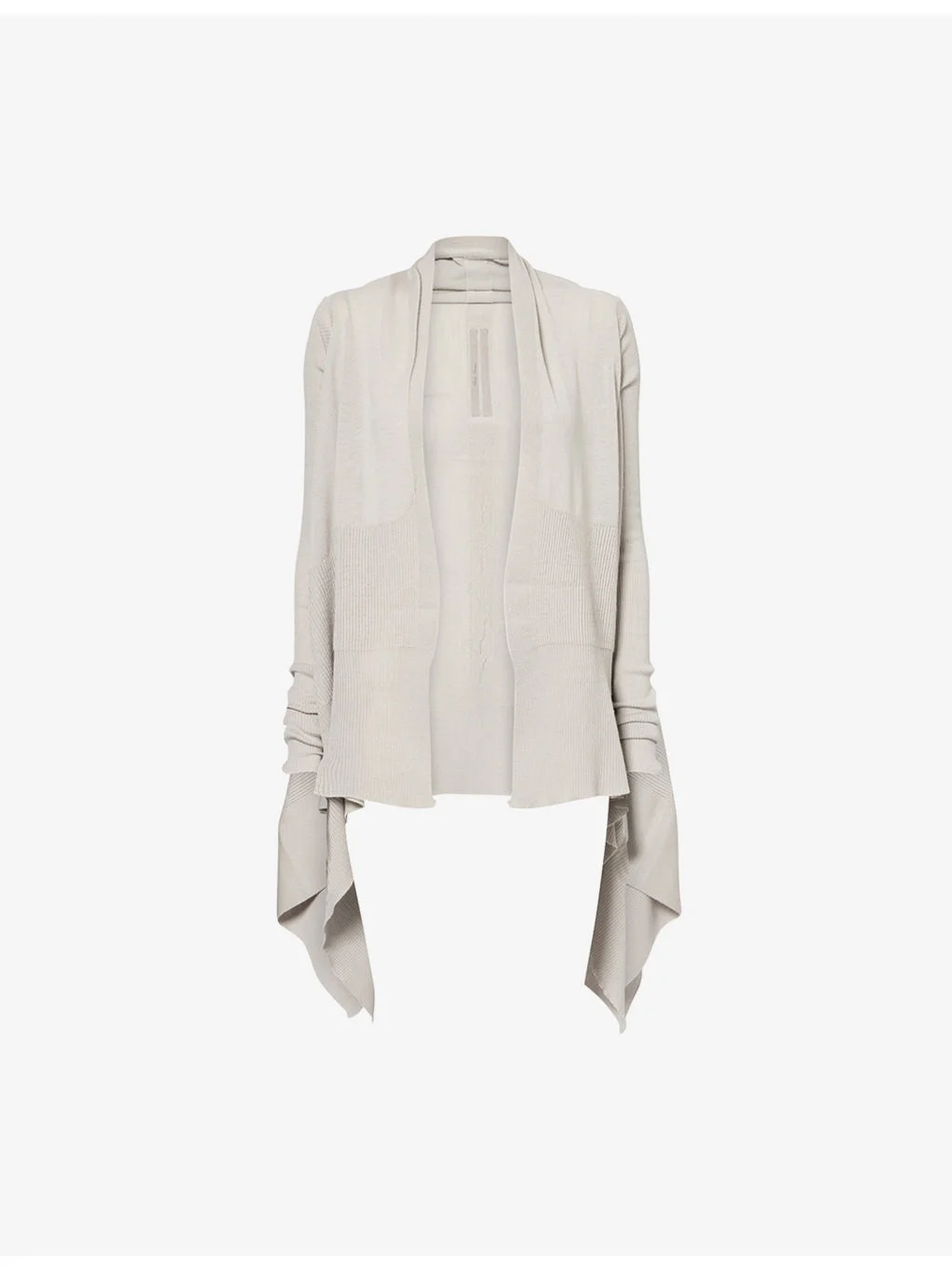 PRODUCT DETAILS - Rick Owens wool cardigan - 100% virgin wool - Regular fit, shawl collar, long sleeves, ribbed panels, all-over fine-knit pattern, asymmetric hem - Hand wash cold - Made in Italy - True to size - Size small: length 22in / 57cm - Model is 5ft 10in/1.78m and wears a size small - Midweight, stretchy Ref: R04583853