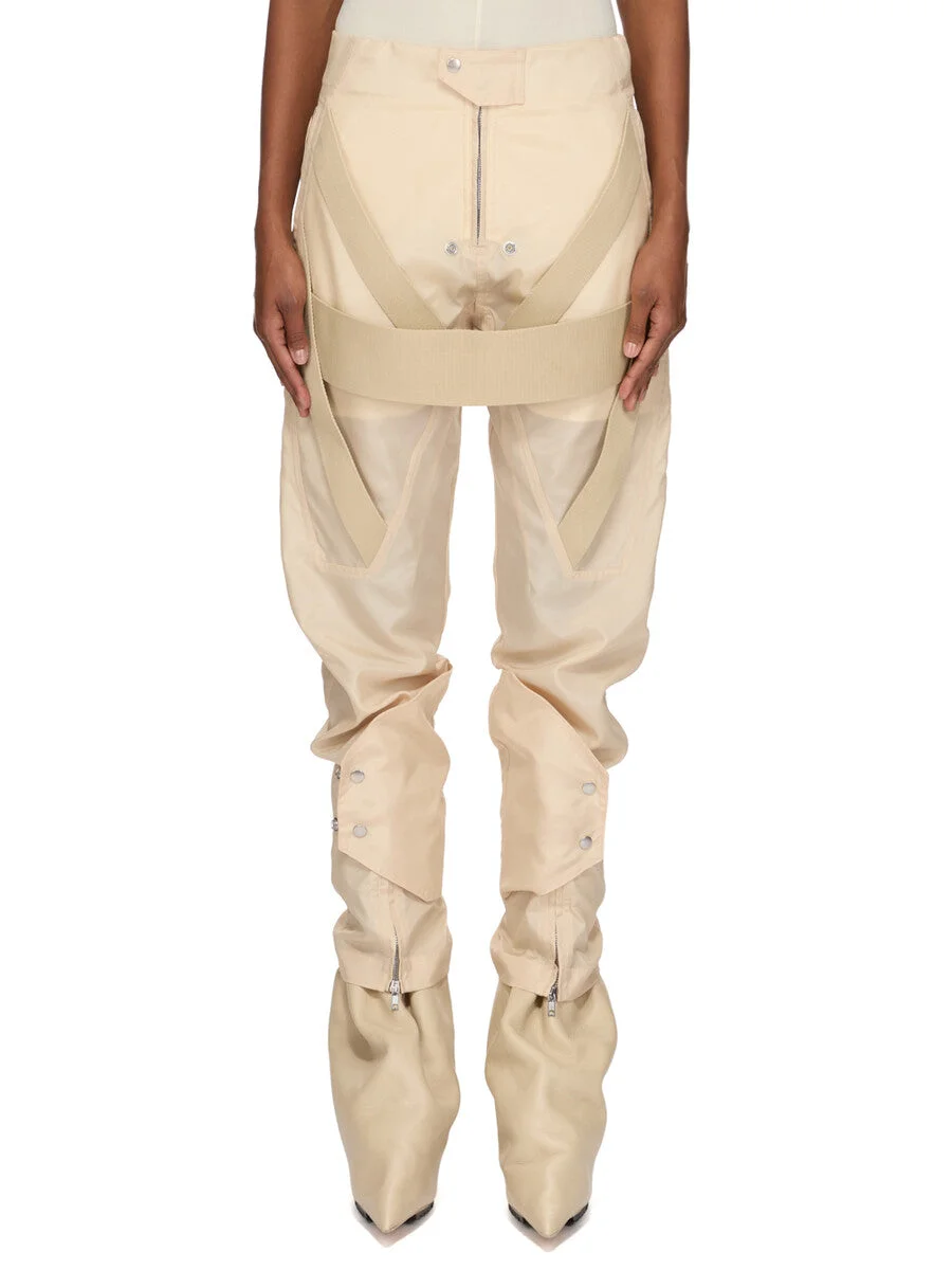 RICK OWENS SS26 TEMPLE MEGASTRAPPED MOTOPANTS IN SAND NYLON CANVAS THESE MEGASTRAPPED MOTOPANTS ARE ANKLE LENGTH AND HAVE A STRAIGHT FIT. THEY HAVE A ZIP FLY WITH BOTTOM SNAP DETAIL AND TOP FLAP WITH OFF-CENTER SNAP, ZIPPERED SIDE POCKETS, AND GEOMETRIC STITCHING ON THE THIGHS. THEY FEATURE AN ELASTICATED BACK WAISTBAND WITH BACK BELT AND TWO SQUARED D-RINGS TO LOOP AND TIGHTEN, AND TWO ZIPPERED POCKETS AND A TWO SNAP FLAP ON SHIN, THAT CONCEALS FRONT SHIN ZIPPERS, ALLOWING THEM TO BE WORN STRAIGHT OR TAPERED. THIS VERSION FEATURES TWO STRAPS ON EACH THIGH AND ONE WIDE STRAP THAT CONNECTS BOTH THIGHS JUST BELOW THE CROTCH. THIS MEDIUMWEIGHT NYLON CANVAS IS COMPACT WITH A CRISP AND TECHNICAL HANDFEEL. THIS FABRIC IS MADE USING GRS CERTIFIED RECYCLED NYLON WHICH ENSURES A REDUCTION IN WATER CONSUMPTION, EMISSIONS AND HAZARDOUS WASTE, LESSENING THE DEPENDENCE ON NON-RENEWABLE RESOURCES. COLOR: SAND MATERIAL:97% NYLON + 3% POLYURETHANE MODEL IS 181CM TALL MODEL WEARS SIZE 40