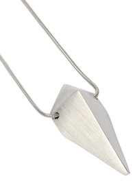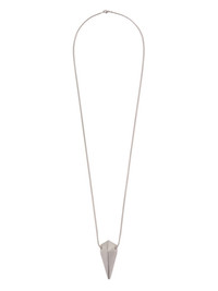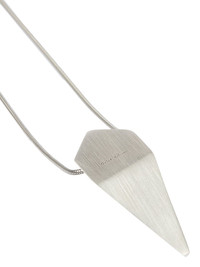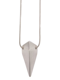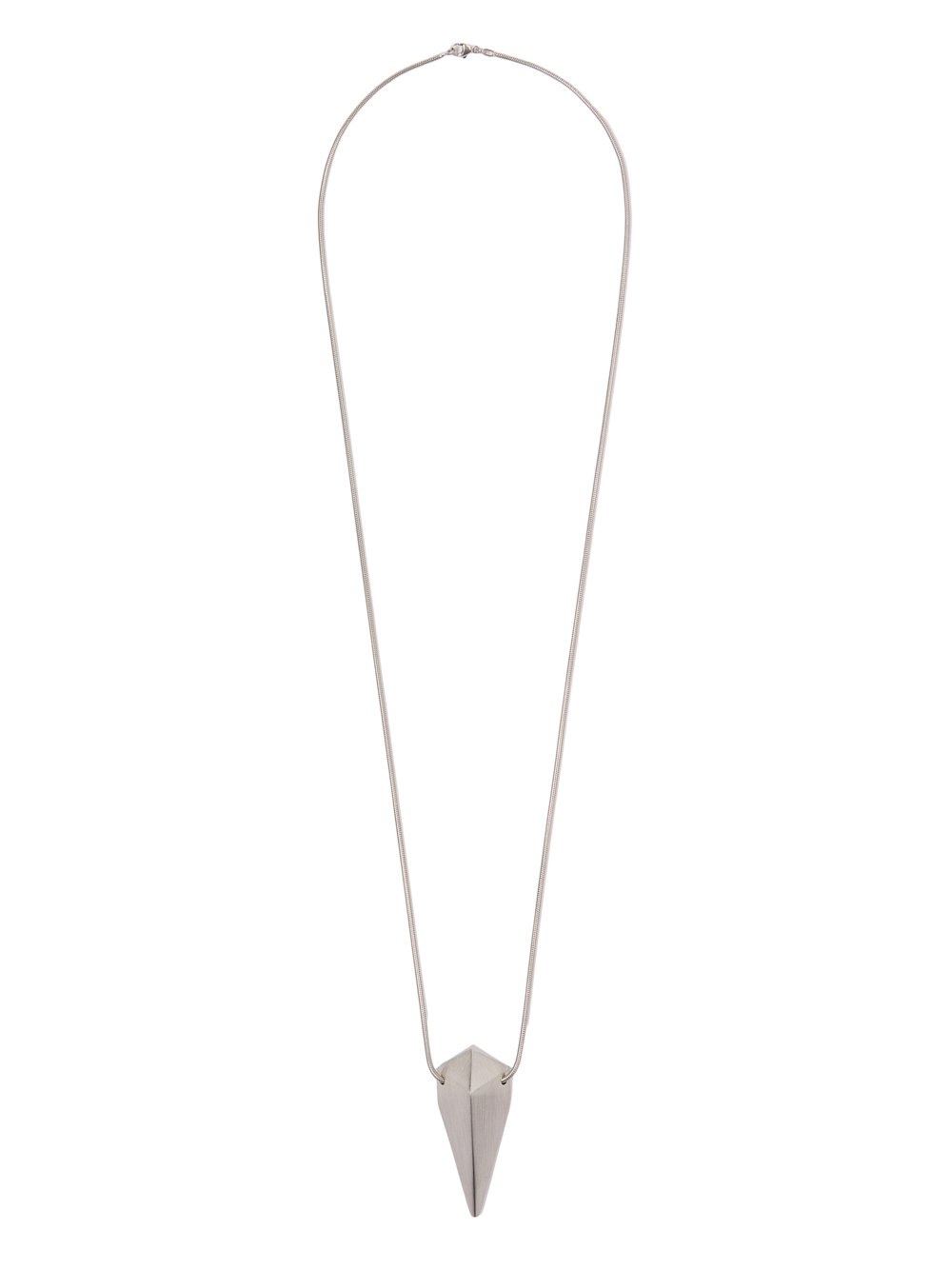 RICK OWENS PYRAMID CHARM IN PALLADIO BRASS THIS PYRAMID CHARM NECKLACE HAS A GEOMETRIC PYRAMID SHAPED CHARM WITH BEVELED EDGES, HANGING FROM A SNAKE CHAIN NECKLACE. IT HAS THE RICK OWENS LOGO ENGRAVED ON THE BACK. THIS JEWELRY PIECE HAS A SEMI-SHINY BRUSHED PALLADIUM FINISH COLOR: PALLADIO MATERIAL: 100% BRASS CHARM LENGTH 5,5CM / CHAIN DROP 35CM