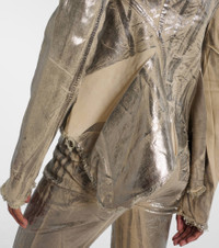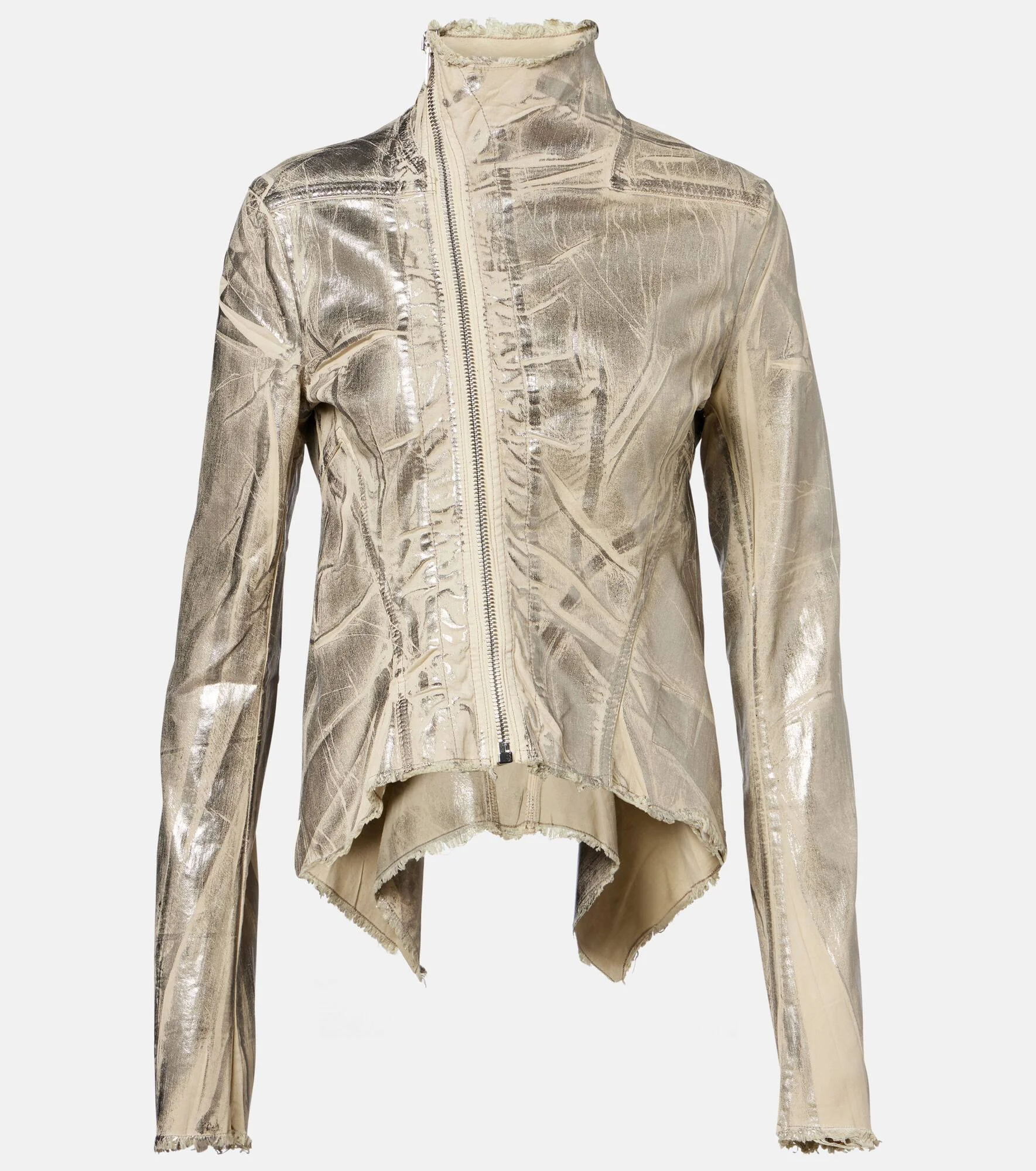 Aptly nicknamed The Lord of Darkness, Rick Owens brings gothic and industrial inspiration to avant-garde design. Made from cotton-blend denim with a silver-toned foil overlay, the Naska Gary features an asymmetric zipper fastening and is defined by distressed detailing. Product Details - Material: 90% cotton, 7% polyester, 3% rubber - Care instructions: hand wash - Made in Italy - Designer color name: Palladium - Item color: silver - Closure: zipped front - Collar: mockneck - Item number: P01069206 Size & Fit - True to size - Cinched waist - Non-stretchy fabric - Slightly cropped - The model seen in the picture is 178cm-5'10" and wearing a size XS