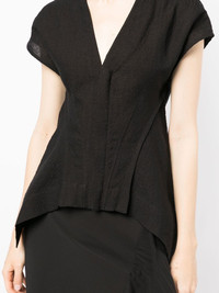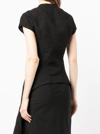 Naska V-neck vest Crafted in a soft blend of linen and wool, this jacket by Rick Owens showcases the brand's distinctive rounded-shoulder silhouette. Drawing inspiration from the cult Naska jacket, the design is complete with a handkerchief hem. Highlights - Black - Linen-wool blend - Cap sleeves - V-neck - Handkerchief hem - Concealed front fastening Made in Italy Composition Linen/Flax 67%, Wool 33% SIZE & FIT Model measurements Height 5 ft 11 in(1.8 m) Bust/Chest 28.34 in(72 cm) Hips 35.43 in(90 cm) Waist 23.62 in(60 cm) FittingInformation This piece fits true to size. We recommend you get your regular size Cut for a loose fit Designed for a close fit at the bust and waist, but loose at the hip Made with a mid-weight non-stretch fabric Washing instructions Dry Clean Only