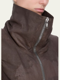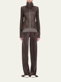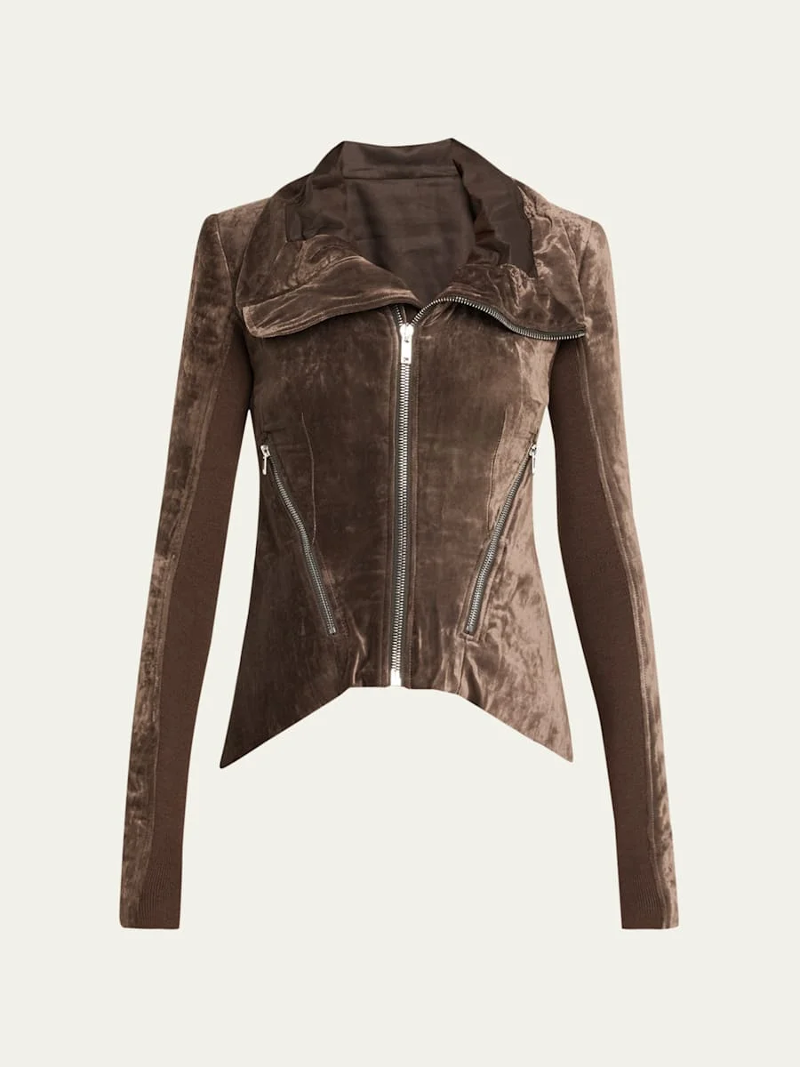 Rick Owens biker jacket in Naska velvet with a figure-flattering hourglass shape and padded shoulders Stand collar; zip front Long sleeves Hip zip pockets Fitted Hip length Viscose/silk Made in Italy Online Inquiries: BGS21_BAAFG| Store Inquiries: #5067660