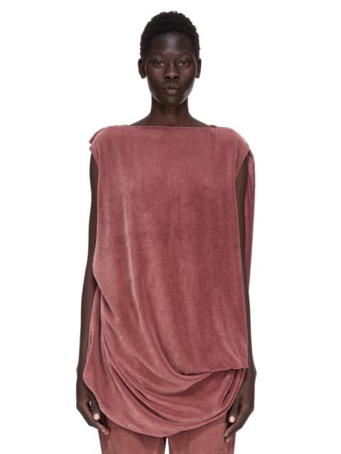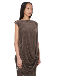 RICK OWENS FW25 CONCORDIANS NOUVEAU TOP IN DARKDUST VELVET THIS NOUVEAU TOP IS HIP LENGTH WITH CAP SLEEVES. IT HAS A BOAT NECK AND AN AMPLE, ELEGANT FIT WITH FRONT AND BACK DRAPINGS, WITH A SHAPED LOWER LEFT SCOOP THIS LIGHTWEIGHT AND FLUID VELVET HAS A SOFT AND WASHED UNEVEN FINISH. THIS FABRIC IS MADE FROM CERTIFIED VISCOSE WHICH ENSURES THAT THE FIBERS ARE PRODUCED FROM RESPONSIBLY MANAGED SOURCES AND NO DEFORESTATION OCCURS COLOR: DARKDUST MATERIAL: 82% VISCOSE + 18% SILK MODEL IS 181CM TALL MODEL WEARS SIZE 40