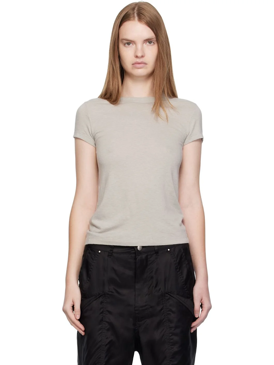Nylon- and viscose-blend jersey T-shirt. · Rib-knit crewneck · Cropped hem · Offset seam at shoulders · Central seam at back Supplier color: Pearl 30% polyamide, 30% viscose, 20% angora, 20% wool. Made in Italy 252232F110019