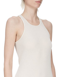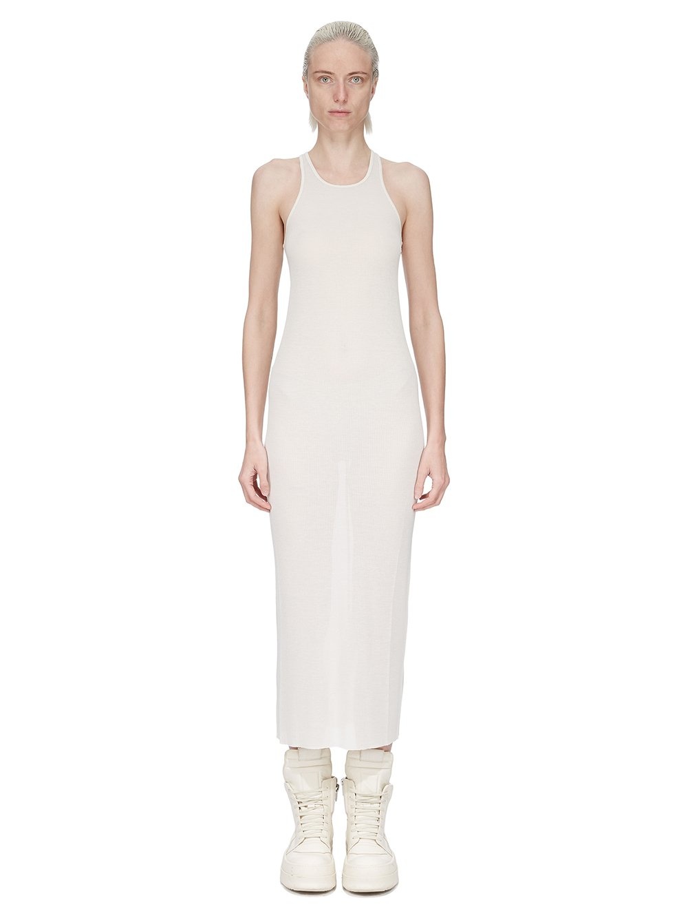 RICK OWENS SS25 HOLLYWOOD TANK DRESS IN DINGE VISCOSE SILK RIB JERSEY THIS TANK DRESS IS BELOW-KNEE LENGTH WITH A CLOSE TO THE BODY FIT. IT HAS A ROUND NECKLINE AND THIN SHOULDER STRAPS THAT FLOW INTO A SLIGHT RACER BACK. IT HAS A RAW CUT HEM AND FEATURES THE SIGNATURE SINGLE SEAM RUNNING DOWN THE CENTER BACK SPINE THIS LIGHTWEIGHT VISCOSE AND SILK RIB JERSEY HAS A DISTINCT RIB PATTERN AND SOFT HANDFEEL THIS JERSEY IS MADE FROM FSC® (FSC – C162846) CERTIFIED VISCOSE WHICH ENSURES THAT THE FIBERS ARE PRODUCED FROM RESPONSIBLY MANAGED SOURCES AND NO DEFORESTATION OCCURS. WE STRIVE TO KEEP OUR PRODUCTION AS LOCAL AS POSSIBLE. THE FULL MANUFACTURING CYCLE OF THIS PRODUCT, FROM THE MATERIAL KNITTING TO SEWING AND FINISHING, WAS UNDERTAKEN CLOSE TO OUR HOME BASE IN CONCORDIA, ITALY COLOR: DINGE MATETIAL: 88% VISCOSE + 12% JERSEY MODEL IS 181CM TALL MODEL WEARS SIZE 40