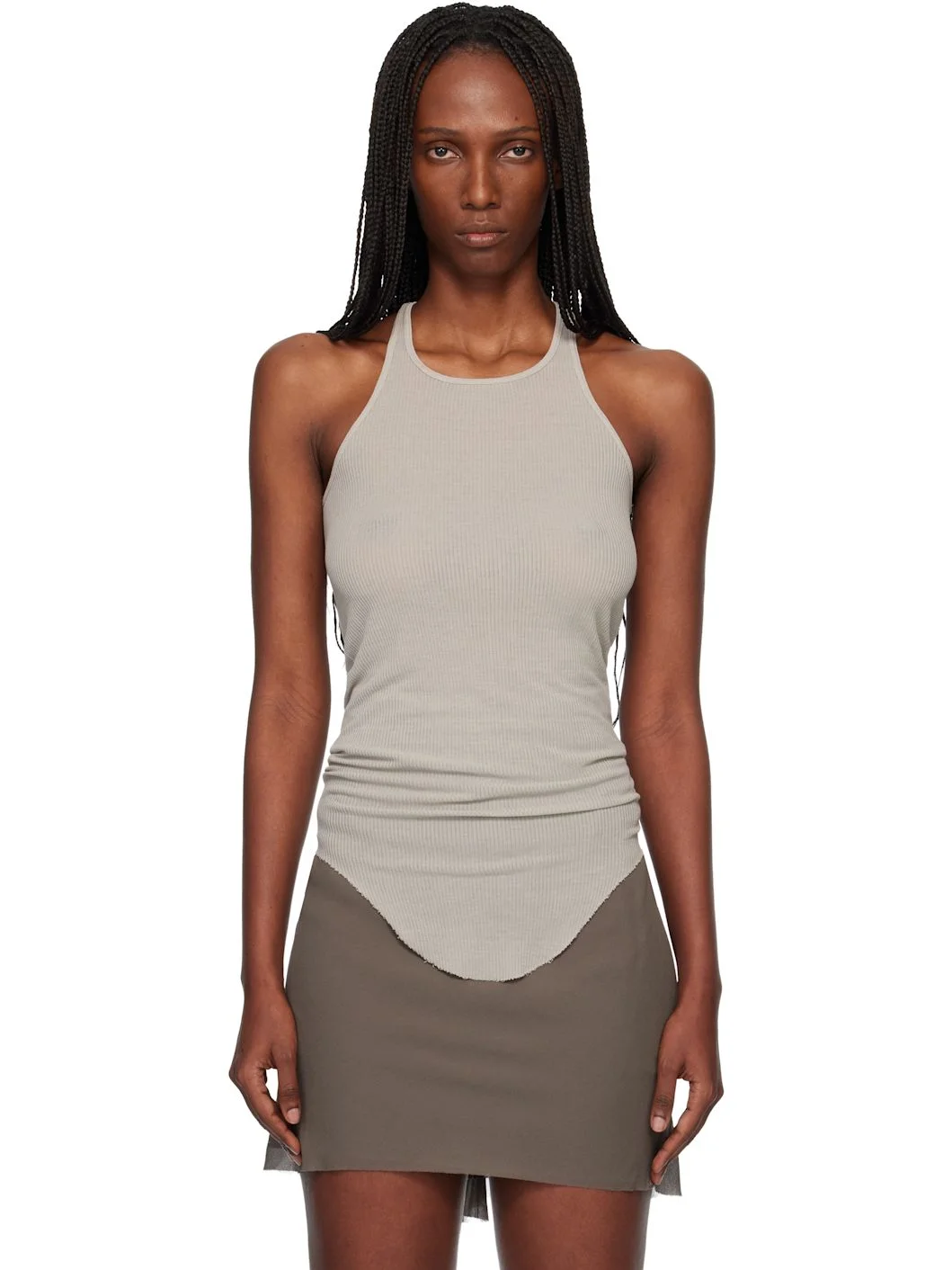 Semi-sheer rib-knit viscose- and silk-blend tank top. · FSC-certified viscose · Crewneck · Raw edge at curved hem · Central seam at back Supplier color: Pearl 88% viscose, 12% silk. Made in Italy 261232F111004