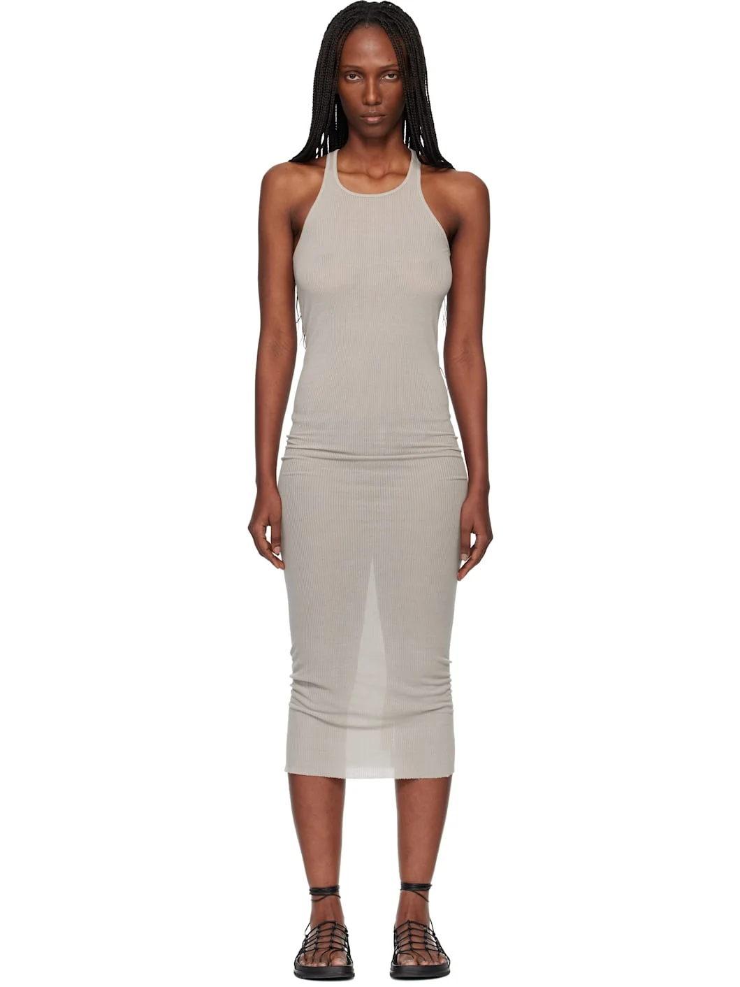 Semi-sheer rib-knit viscose- and silk-blend midi dress. · FSC-certified viscose · Crewneck · Raw edge at hem · Central seam at back Supplier color: Pearl 88% viscose, 12% silk. Made in Italy 261232F054043