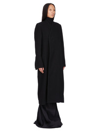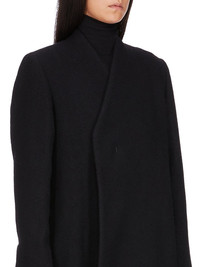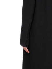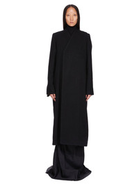 RICK OWENS FW25 CONCORDIANS MUSEUM COAT IN BLACK BOILED WOOL THIS MUSEUM COAT IS MID-CALF LENGTH WITH LONG SLEEVES WITH BUTTONED CUFFS. IT HAS FRONT CONCEALED BUTTON FASTENING AT FRONT AND A V NECK. IT FEATURES AN INNER CUPRO LINING WITH SLEEVES THAT PULL OUT FROM THE ARMHOLE ALLOWING THE UPPER PART OF THE COAT TO BE WORN HANGING DOWN AT THE BACK. IT HAS TWO SIDE SEAM POCKETS AND A BACK VENT. IT IS FULLY LINED AND HAS INTERNAL BUTTONED POCKETS. THIS HEAVYWEIGHT WOOL FABRIC IS WOVEN IN A DIAGONAL TWILL WEAVE AND THEN FINISHED IN MULTIPLE STEPS INCLUDING TUMBLING AND BRUSHING TO ACHIEVE ITS FINAL SOFTNESS AND TEXTURE THIS FABRIC IS MADE FROM RWS CERTIFIED VIRGIN WOOL WHICH ENSURES A HIGH STANDARD IN ANIMAL WELFARE, ENVIRONMENTAL SUSTAINABILITY AND SOCIAL RESPONSIBILITY. EACH BALE OF WOOL IS TRACEABLE BACK TO ITS SOURCE COLOR: BLACK MATERIAL: 100% NEW WOOL BODY AND SLEEVES LINING 100% CUPRO POCKETS LINING 100% COTTON BUTTONS 100% BUFFALO HORN MODEL IS 181CM TALL MODEL WEARS SIZE 40