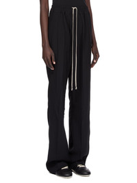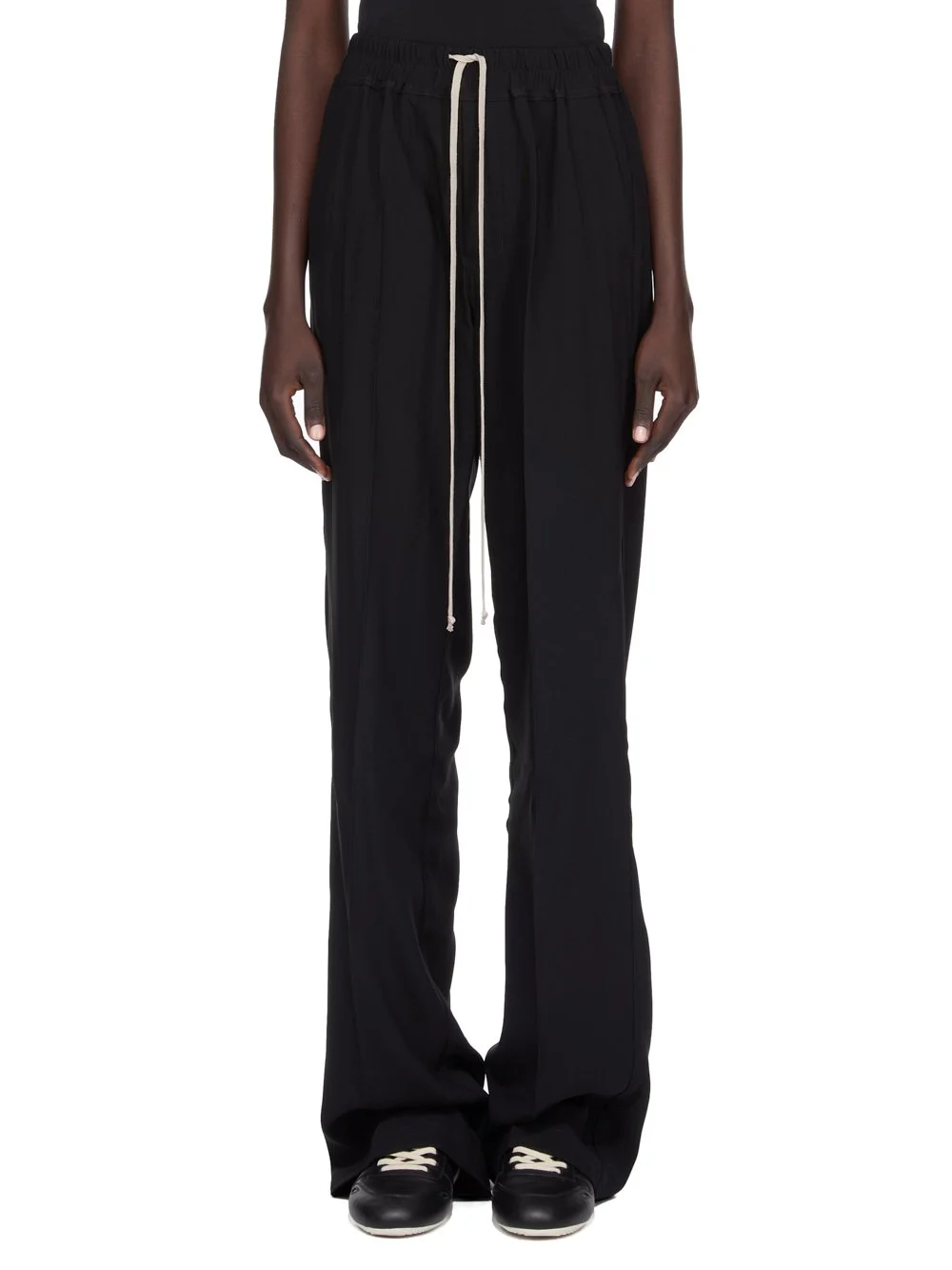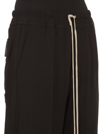 RICK OWENS FW25 CONCORDIANS DIETRICH DRAWSTRING IN BLACK HEAVY CADY THESE DIETRICH DRAWSTRINGS ARE FULL-LENGTH WITH A LOOSE STRAIGHT LEG. THEY HAVE AN ELASTICIZED WAISTBAND WITH DRAWSTRING, AND A STITCHED FLY. THEY HAVE SIDE SEAM POCKETS AND TWO REAR SQUARE PATCH POCKETS WITH FLAPS THIS MEDIUMWEIGHT CADY CREPE IS FLUID WITH A CRISP SURFACE TEXTURE AND A COOL SLICK BACKSIDE. THIS FABRIC IS MADE FROM FSC® - CERTIFIED (FSC - C162846) VISCOSE AND ACETATE WHICH ENSURES THAT THE FIBERS ARE PRODUCED FROM RESPONSIBLY MANAGED SOURCES AND NO DEFORESTATION OCCURS COLOR: BLACK MATERIAL: 53% VISCOSE + 47% ACETATE MODEL IS 181CM TALL MODEL WEARS SIZE 40