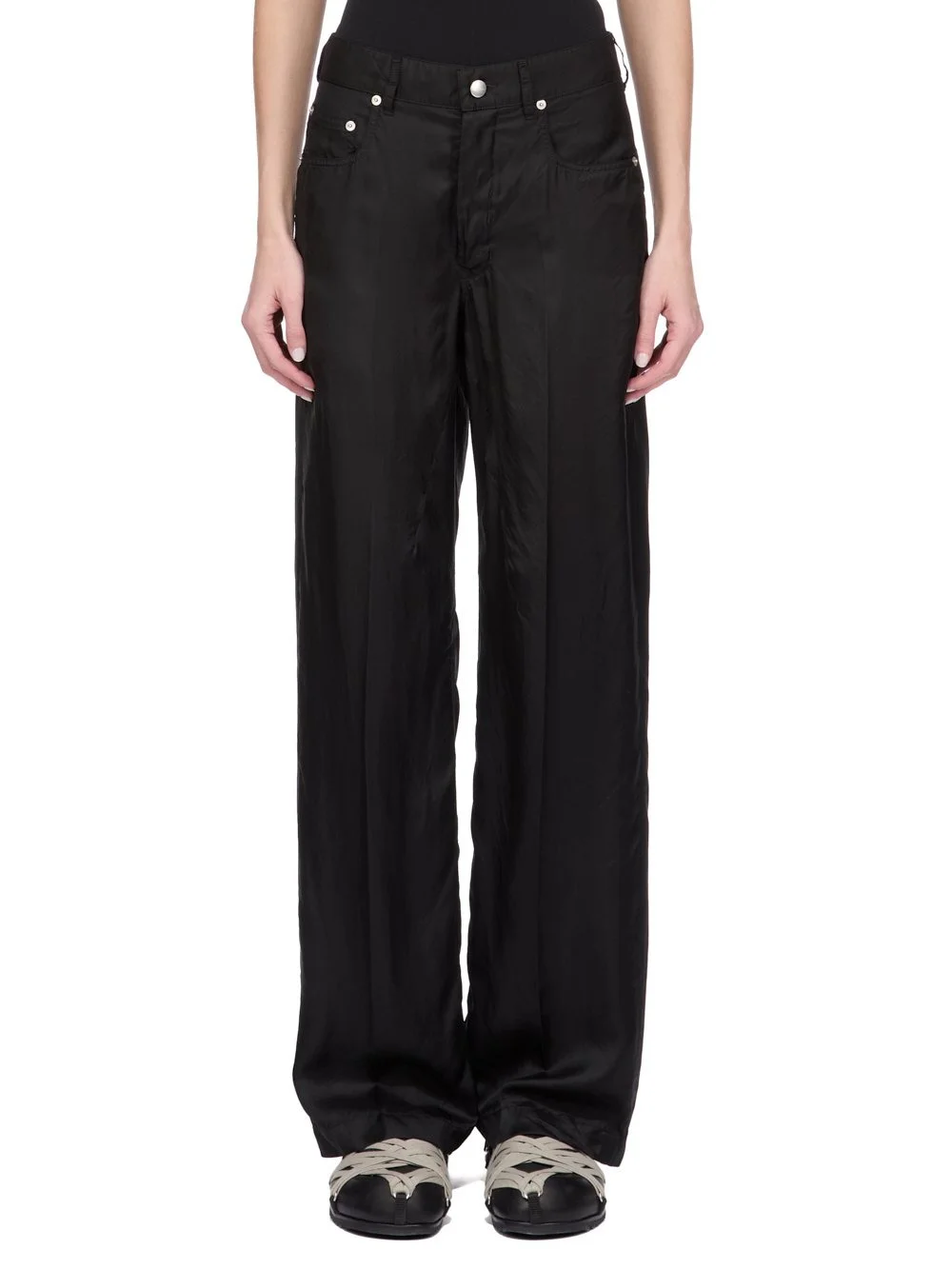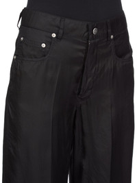 RICK OWENS FW25 CONCORDIANS GETH JEANS IN BLACK CUPRO TWILL THESE GETH JEANS ARE A FULL LENGTH 5 POCKET JEAN WITH A LOW-RISE AND WIDE FIT. THEY HAVE A SILVER BUTTON FLY, BELT LOOPS AND POCKET RIVETS THIS LIGHTWEIGHT AND FLUID CUPRO TWILL HAS A GLOSSY SURFACE AND A SOFT, WASHED HANDFEEL THIS FABRIC IS MADE USING CUPRO WHICH IS BIODEGRADABLE AND 100% PLANT BASED. AS IT’S MADE FROM COTTON WASTE, CUPRO HELPS FIND A PURPOSE TO FIBERS THAT WOULD OTHERWISE BE DISCARDED COLOR: BLACK MATERIAL: 100% CUPRO MODEL IS 181CM TALL MODEL WEARS SIZE 26