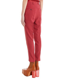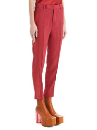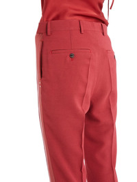 RICK OWENS FW21 GETHSEMANE AUSTIN PANTS IN WOOL CREPE AND LIQUID LATEX SATIN THESE AUSTIN PANTS ARE ABOVE-THE-ANKLE LENGTH WITH A SLIM FIT. THEY HAVE AN CLASSIC WAISTBAND WITH ZIP AND WRAP BUTTON CLOSURE, 2 SIDE SLIT POCKETS WITH RIVET DETAIL, TWO BACK WELT POCKETS WITH BUTTONS, AND PRESSED FRONT AND BACK SEAMS. THIS VERSION HAS A LIQUID LATEX WAISTBAND AND STRIPE RUNNING DOWN THE OUTSIDE LEG A COMBINATION OF WOOL CREPE WOVEN IN THE BIELLA REGION OF ITALY FAMOUS FOR ITS TRADITION OF TAILORED WOOL PRODUCTION AND LIQUID LATEX SATIN, A SATIN WITH A GLOSSY LATEX-LIKE FINISH - COLOR: CARNELIAN - MATERIAL: 53% NEW WOOL, 47% VISCOSE - LEG LATERAL DETAILS: 61% ACETATE, 39% NYLON - LINING: 100% CUPRO - MODEL IS WEARING SIZE 40 - MODEL IS 181 CM TALL