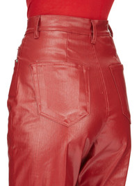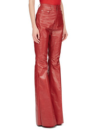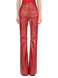 RICK OWENS SS24 LIDO BOLAN BOOTCUT IN CARDINAL RED COATED STRETCH DENIM THIS BOLAN BOOTCUT IS A HIGH WAISTED, SLIM FIT 5 POCKET JEAN WITH A FLOOR-LENGTH BOOT CUT. THEY CLOSE WITH A VISIBLE WAIST BUTTON AND HAVE A CONCEALED BUTTON FLY. THEY FEATURE A WAISTBAND WITH BELT LOOPS AND POCKET RIVETS AND BACK PATCH POCKETS WITH TOPSTITCHING THIS LIGHTWEIGHT STRETCH DENIM IS COVERED WITH A SEMI-SHINY AND SOFT COATING. THE INDIGO COLOR AND STRUCTURE OF THE DENIM SHINES THROUGH THE COLOR OF THE COATING CREATING A MULTILAYERED AND IRREGULAR COLORATION. THE NATURAL ASPECTS OF THIS FABRIC MEANS THE COATING HAS PEELED OFF IN CERTAIN AREAS, EXPOSING THE UNDERLAYING MATERIAL AND WILL CONTINUE TO DO SO WITH WEAR AND ABRASION. THIS IS AN INHERENT CHARACTERISTIC OF THIS TYPE OF TREATMENT AND IS A DESIRED A VISUAL ASPECT WHICH ADDS TO THE UNIQUENESS OF EACH PIECE AND SHOULD NOT BE CONSIDERED A DEFECT - COLOR: CARDINAL RED - MATERIAL: 91% COTTON + 6% ELASTOMULTIESTER + 3% RUBBER - POCKETS LINING 100% COTTON - MODEL IS 181CM TALL - MODEL WEARS SIZE 26