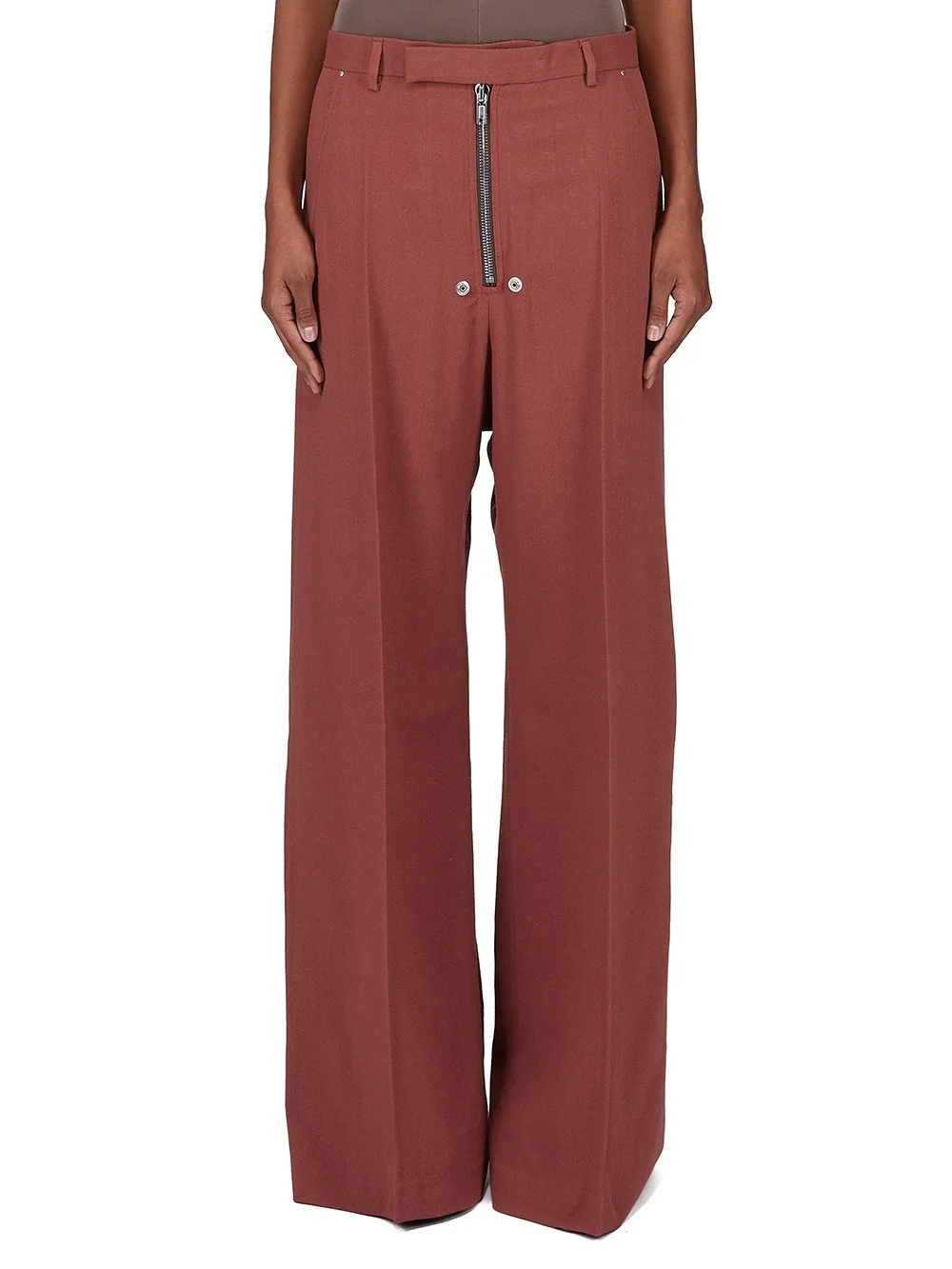 RICK OWENS FW25 CONCORDIANS TAILORED WIDE BELAS IN ROSEWOOD WOOL SABLE THESE TAILORED WIDE BELAS ARE FULL-LENGTH WITH A LOW CROTCH AND WIDE LEG. THEY FEATURE A WAISTBAND WITH BELT LOOPS, BUTTON CLOSURE AND A BELA EXPOSED CENTER ZIPPER WITH TWO SNAP DETAIL AT BOTTOM. THEY HAVE SIDE WELT POCKETS WITH RIVET AND EYELET DETAIL AND TWO REAR WELT POCKETS WITH SNAPS AND TOPSTITCHING THIS MEDIUMWEIGHT WOOL SABLE FABRIC IS WOVEN WITH HIGH TWIST CREPE YARNS THAT CREATE A DRY HANDFEEL AND TEXTURED SURFACE. IT IS WOVEN IN THE BIELLA REGION OF ITALY RENOWNED FOR ITS LONG TRADITION OF TAILORED WOOL THIS FABRIC IS MADE FROM ZQ CERTIFIED VIRGIN WOOL WHICH ENSURES A HIGH STANDARD IN ANIMAL WELFARE, ENVIRONMENTAL SUSTAINABILITY AND SOCIAL RESPONSIBILITY. EACH BALE OF WOOL IS TRACEABLE BACK TO ITS SOURCE COLOR: BLACK MATERIAL: 100% NEW WOOL BUTTONS 100% BUFFALO HORN MODEL IS 181CM TALL MODEL WEARS SIZE 40