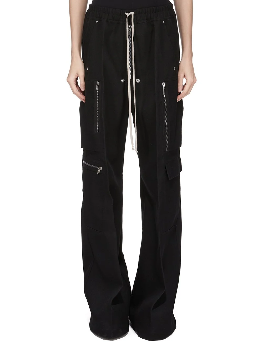 RICK OWENS FW25 CONCORDIANS CARGOBELAS IN BLACK WOOL DRILL THESE CARGOBELAS PANTS ARE FULL-LENGTH WITH A LOW CROTCH AND WIDE LEG. THEY FEATURE AN ELASTICIZED WAISTBAND WITH DRAWSTRING AND A BELA EXPOSED CENTER ZIPPER WITH TWO SNAP DETAIL AT BOTTOM. THEY HAVE SIDE WELT POCKETS WITH RIVET AND EYELET DETAIL, FOUR BEVELED CARGO POCKETS ON THE SIDE LEG AND TWO REAR WELT POCKETS WITH CONCEALED SNAPS AND TOPSTITCHING. THIS MEDIUMWEIGHT WOOL DRILL FABRIC HAS A DISTINCT DRILL TEXTURE AND A DRY HANDFEEL. THIS FABRIC IS MADE FROM RWS CERTIFIED VIRGIN WOOL WHICH ENSURES A HIGH STANDARD IN ANIMAL WELFARE, ENVIRONMENTAL SUSTAINABILITY AND SOCIAL RESPONSIBILITY. EACH BALE OF WOOL IS TRACEABLE BACK TO ITS SOURCE. COLOR: BLACK MATERIAL: 100% WOOL MODEL IS 181CM TALL MODEL WEARS SIZE 40