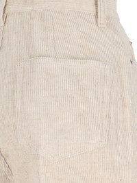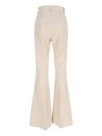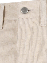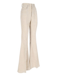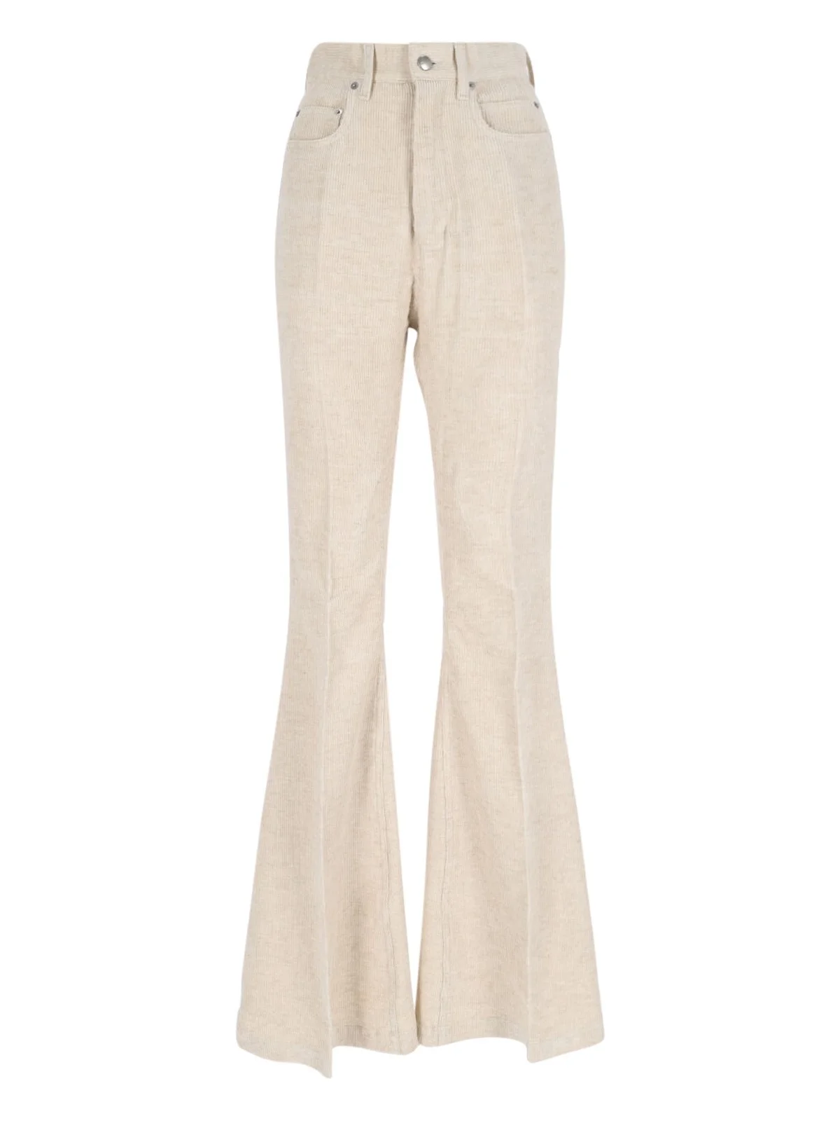 RICK OWENS BOOTCUT TROUSERS IN CREAM COTTON AND LINEN, RIBBED KNIT, HIGH WAIST, BELT LOOPS, BUTTON CLOSURE, FIVE POCKET DESIGN, WIDE LEG. PRODUCT INFO PRODUCT CODE RP02E4329 MLC21 COMPOSITION: 74% COTTON, 26% LINEN SIZE AND FIT: REGULAR FIT MADE IN: ITALY - "DENIM" SIZE SCALE