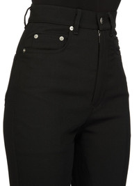 RICK OWENS SS26 TEMPLE BOLAN BOOTCUT IN BLACK TWISTED WOOL THIS BOLAN BOOTCUT IS A HIGH WAISTED, SLIM FIT, 5 POCKET JEAN WITH A FLOOR-LENGTH BOOT CUT. THEY HAVE A CONCEALED BUTTON FLY AND A WAISTBAND WITH CENTER BUTTON, BELT LOOPS AND POCKET RIVETS AND BACK PATCH POCKETS WITH TOPSTITCHING THIS MEDIUMWEIGHT WOOL IS WOVEN USING HIGH TWISTED YARNS WHICH CREATES THE SURFACE TEXTURE AND DRY HANDFEEL IT IS MADE IN A FIFTH GENERATION MILL, FOUNDED IN 1883 IN AICHI PREFECTURE, JAPAN COLOR: BLACK MATERIAL:100% WOOL MODEL IS 181CM TALL MODEL WEARS SIZE 26