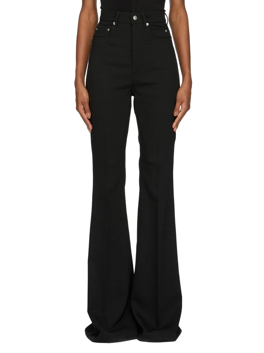 RICK OWENS SS26 TEMPLE BOLAN BOOTCUT IN BLACK TWISTED WOOL THIS BOLAN BOOTCUT IS A HIGH WAISTED, SLIM FIT, 5 POCKET JEAN WITH A FLOOR-LENGTH BOOT CUT. THEY HAVE A CONCEALED BUTTON FLY AND A WAISTBAND WITH CENTER BUTTON, BELT LOOPS AND POCKET RIVETS AND BACK PATCH POCKETS WITH TOPSTITCHING. THIS MEDIUMWEIGHT WOOL IS WOVEN USING HIGH TWISTED YARNS WHICH CREATES THE SURFACE TEXTURE AND DRY HANDFEEL. IT IS MADE IN A FIFTH GENERATION MILL, FOUNDED IN 1883 IN AICHI PREFECTURE, JAPAN. COLOR: BLACK MATERIAL:100% WOOL MODEL IS 181CM TALL MODEL WEARS SIZE 26