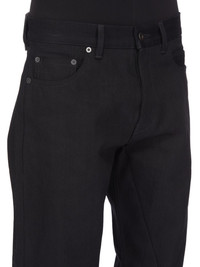 DRKSHDW FW25 CONCORDIANS KURDT IN 16OZ BLACK DENIM THIS KURDT PANT IS A MID-RISE, STRAIGHT FIT, 6 POCKET JEAN, WITH A BUTTON FLY. THEY FEATURE A BLACK LEATHER DRKSHDW DEBOSSED PATCH ON THE REAR OF THE WAISTBAND THE BELT LOOPS ARE SEWN INTO THE WAISTBAND, FOR ADDED STRENGTH. THERE IS A SELVEDGE DETAIL ON THE 'COIN POCKET', AND THE OUTSEAM (32" INSEAM) AND HIDDEN RIVETS IN THE REAR POCKETS. THEY HAVE A CHAINSTITCH HEM. ALL HARDWARE IS YKK (MADE IN JAPAN) THIS HEAVYWEIGHT 16OZ DENIM IS WOVEN IN IBARA CITY, OKAYAMA PREFECTURE, JAPAN, BY YAMAASHI ORIMONO (EST. 1945) ON VINTAGE SAKAMOTO SHUTTLE LOOMS. USING BLACK WARP AND BLACK WEFT YARNS, WITH BLACK SELVEDGE COLOR: BLACK MATERIAL: 100% COTTON MODEL IS 189CM TALL MODEL WEARS SIZE 31