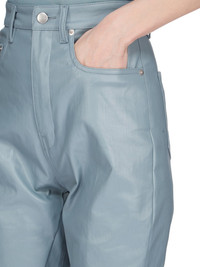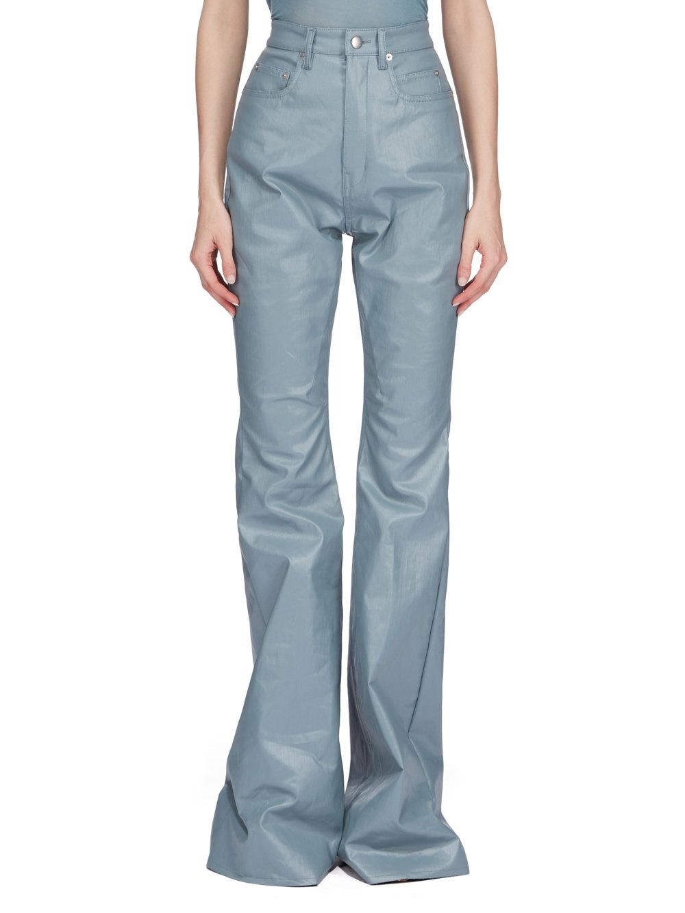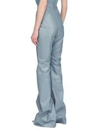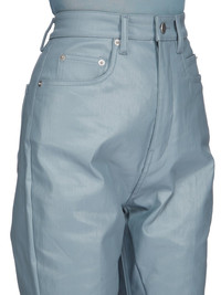 RICK OWENS SS25 HOLLYWOOD BOLAN BOOTCUT IN MOUTHWASH COATED STRETCH DENIM THIS BOLAN BOOTCUT IS A HIGH WAISTED, SLIM FIT, 5 POCKET JEAN WITH A FLOOR-LENGTH BOOT CUT. THEY HAVE A CONCEALED BUTTON FLY AND A WAISTBAND WITH CENTER BUTTON, BELT LOOPS AND POCKET RIVETS AND BACK PATCH POCKETS WITH TOPSTITCHING THIS LIGHTWEIGHT STRETCH DENIM IS COVERED WITH A SEMI-SHINY AND SOFT COATING. THE INDIGO COLOR AND STRUCTURE OF THE DENIM SHINES THROUGH THE COLOR OF THE COATING CREATING A MULTILAYERED AND IRREGULAR COLORATION. THE NATURAL ASPECTS OF THIS FABRIC MEANS THE COATING HAS PEELED OFF IN CERTAIN AREAS, EXPOSING THE UNDERLAYING MATERIAL AND WILL CONTINUE TO DO SO WITH WEAR AND ABRASION. THIS IS AN INHERENT CHARACTERISTIC OF THIS TYPE OF TREATMENT AND IS A DESIRED A VISUAL ASPECT WHICH ADDS TO THE UNIQUENESS OF EACH PIECE AND SHOULD NOT BE CONSIDERED A DEFECT THIS FABRIC IS MADE USING OCS CERTIFIED ORGANIC COTTON WHICH MEANS THE NATURAL FIBER IS GROWN WITHOUT HARMFUL CHEMICALS, LEAVING OUR SOIL, AIR AND WATER CLEANER FROM CONTAMINATES COLOR: MOUTHWASH MATERIAL: 91% COTTON + 6% ELASTOMULTIESTER + 3% RUBBER POCKETS LINING 100% COTTON MODEL IS 181CM TALL MODEL WEARS SIZE 26