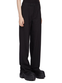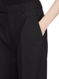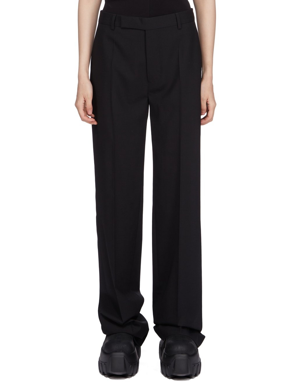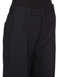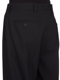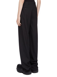 RICK OWENS SS25 HOLLYWOOD DIETRICH TROUSERS IN BLACK PAPER FINISH WOOL THESE DIETRICH TROUSERS ARE FULL LENGTH PANTS WITH A STRAIGHT FIT AND A REGULAR CROTCH. THEY HAVE A CLASSIC TAILORED WAISTBAND WITH A CONCEALED ZIPPER AND WRAP BUTTON CLOSURE, TWO SIDE SEAM POCKETS, TWO BACK WELT POCKETS WITH BUTTONS, AND PRESSED CREASES ON THE FRONT AND BACK LEG THIS MEDIUMWEIGHT WOOL FABRIC HAS A DRY PAPERY HANDFEEL. IT IS WOVEN IN THE BIELLA REGION OF ITALY RENOWNED FOR ITS LONG TRADITION OF TAILORED WOOL. THIS FABRIC IS MADE FROM ZQ CERTIFIED VIRGIN WOOL WHICH ENSURES A HIGH STANDARD IN ANIMAL WELFARE, ENVIRONMENTAL SUSTAINABILITY AND SOCIAL RESPONSIBILITY. EACH BALE OF WOOL IS TRACEABLE BACK TO ITS SOURCE COLOR: BLACK MATERIAL: 96% NEW WOOL + 4% ELASTANELINIGN 100% CUPROBUTTONS 100% BUFFALO HORN MODEL IS 181CM TALL MODEL WEARS SIZE 40