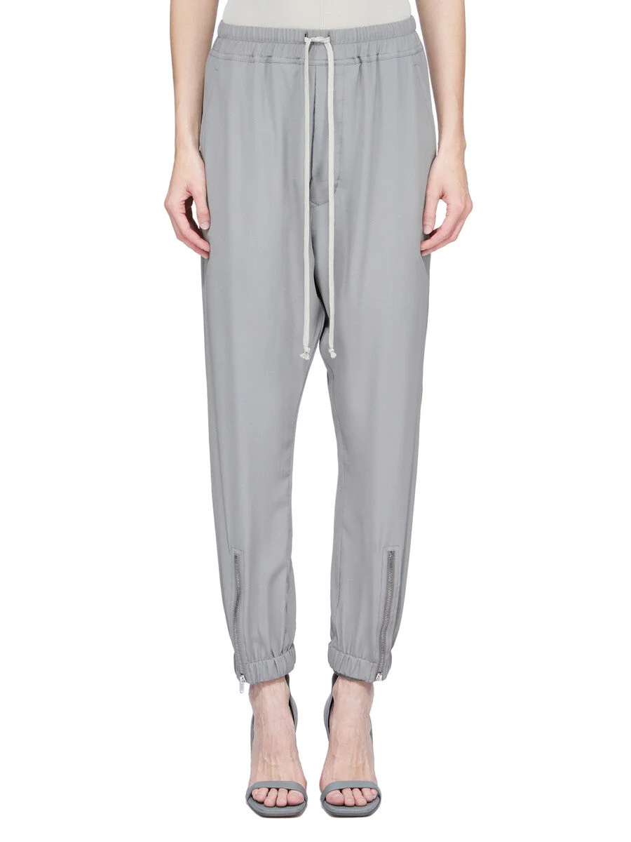 RICK OWENS SS26 TEMPLE TECUATL TRACK PANT IN EUCA COCOON CREPE THESE TECUATL TRACK PANTS ARE FULL-LENGTH WITH A SLIGHTLY DROPPED CROTCH. THEY HAVE AN ELASTICIZED WAISTBAND WITH A DRAWSTRING, AND A STITCHED FLY. THEY FEATURE TWO DIAGONAL SIDE FRONT POCKETS, BACK WELT POCKETS WITH SNAPS AND ELASTICIZED HEMS WITH A ZIPPERED SLIT ON THE FRONT SHIN. THIS LIGHTWEIGHT AND FLUID SILK BLEND CREPE IS MATTE AND HAS A DRY HANDFEEL. THIS FABRIC IS MADE FROM FSC® CERTIFIED (FSC – C162846) ACETATE WHICH ENSURES THAT THE FIBERS ARE PRODUCED FROM RESPONSIBLY MANAGED SOURCES AND NO DEFORESTATION OCCURS. COLOR: EUCA MATERIAL: 64% ACETATE + 36% SILK BUTTONS 100% BUFFALO HORN MODEL IS 181CM TALL MODEL WEARS SIZE 40