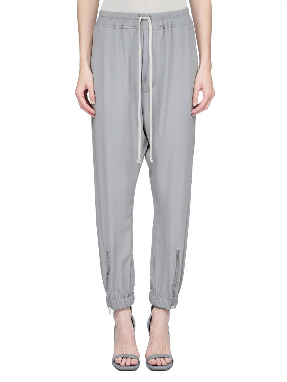 RICK OWENS SS26 TEMPLE TECUATL TRACK PANT IN EUCA COCOON CREPE THESE TECUATL TRACK PANTS ARE FULL-LENGTH WITH A SLIGHTLY DROPPED CROTCH. THEY HAVE AN ELASTICIZED WAISTBAND WITH A DRAWSTRING, AND A STITCHED FLY. THEY FEATURE TWO DIAGONAL SIDE FRONT POCKETS, BACK WELT POCKETS WITH SNAPS AND ELASTICIZED HEMS WITH A ZIPPERED SLIT ON THE FRONT SHIN THIS LIGHTWEIGHT AND FLUID SILK BLEND CREPE IS MATTE AND HAS A DRY HANDFEEL THIS FABRIC IS MADE FROM FSC® CERTIFIED (FSC – C162846) ACETATE WHICH ENSURES THAT THE FIBERS ARE PRODUCED FROM RESPONSIBLY MANAGED SOURCES AND NO DEFORESTATION OCCURS COLOR: EUCA MATERIAL: 64% ACETATE + 36% SILK BUTTONS 100% BUFFALO HORN MODEL IS 181CM TALL MODEL WEARS SIZE 40