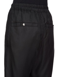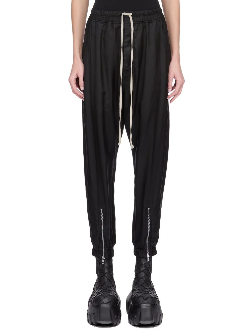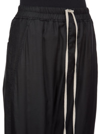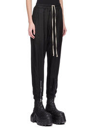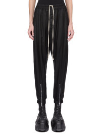RICK OWENS FW25 CONCORDIANS TECUATL TRACK PANT IN BLACK CUPRO TWILL THESE TECUATL TRACK PANTS ARE FULL-LENGTH WITH A SLIGHTLY DROPPED CROTCH. THEY HAVE AN ELASTICIZED WAISTBAND WITH A DRAWSTRING, AND A STITCHED FLY. THEY FEATURE TWO DIAGONAL SIDE FRONT POCKETS, BACK WELT POCKETS WITH SNAPS AND ELASTICIZED HEMS WITH A ZIPPERED SLIT ON THE FRONT SHIN THIS LIGHTWEIGHT AND FLUID CUPRO TWILL HAS A GLOSSY SURFACE AND A SOFT, WASHED HANDFEEL THIS FABRIC IS MADE USING CUPRO WHICH IS BIODEGRADABLE AND 100% PLANT BASED. AS IT’S MADE FROM COTTON WASTE, CUPRO HELPS FIND A PURPOSE TO FIBERS THAT WOULD OTHERWISE BE DISCARDED COLOR: BLACK MATERIAL: 100% CUPRO BUTTONS 100% BUFFALO HORN MODEL IS 181CM TALL MODEL WEARS SIZE 40