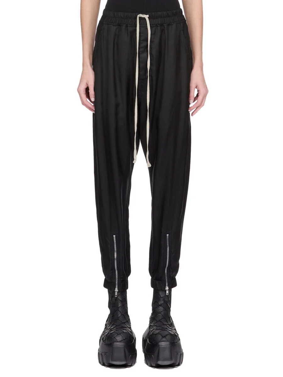 RICK OWENS FW25 CONCORDIANS TECUATL TRACK PANT IN BLACK CUPRO TWILL THESE TECUATL TRACK PANTS ARE FULL-LENGTH WITH A SLIGHTLY DROPPED CROTCH. THEY HAVE AN ELASTICIZED WAISTBAND WITH A DRAWSTRING, AND A STITCHED FLY. THEY FEATURE TWO DIAGONAL SIDE FRONT POCKETS, BACK WELT POCKETS WITH SNAPS AND ELASTICIZED HEMS WITH A ZIPPERED SLIT ON THE FRONT SHIN. THIS LIGHTWEIGHT AND FLUID CUPRO TWILL HAS A GLOSSY SURFACE AND A SOFT, WASHED HANDFEEL. THIS FABRIC IS MADE USING CUPRO WHICH IS BIODEGRADABLE AND 100% PLANT BASED. AS IT’S MADE FROM COTTON WASTE, CUPRO HELPS FIND A PURPOSE TO FIBERS THAT WOULD OTHERWISE BE DISCARDED. COLOR: BLACK MATERIAL: 100% CUPRO BUTTONS 100% BUFFALO HORN MODEL IS 181CM TALL MODEL WEARS SIZE 40