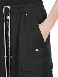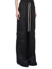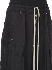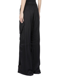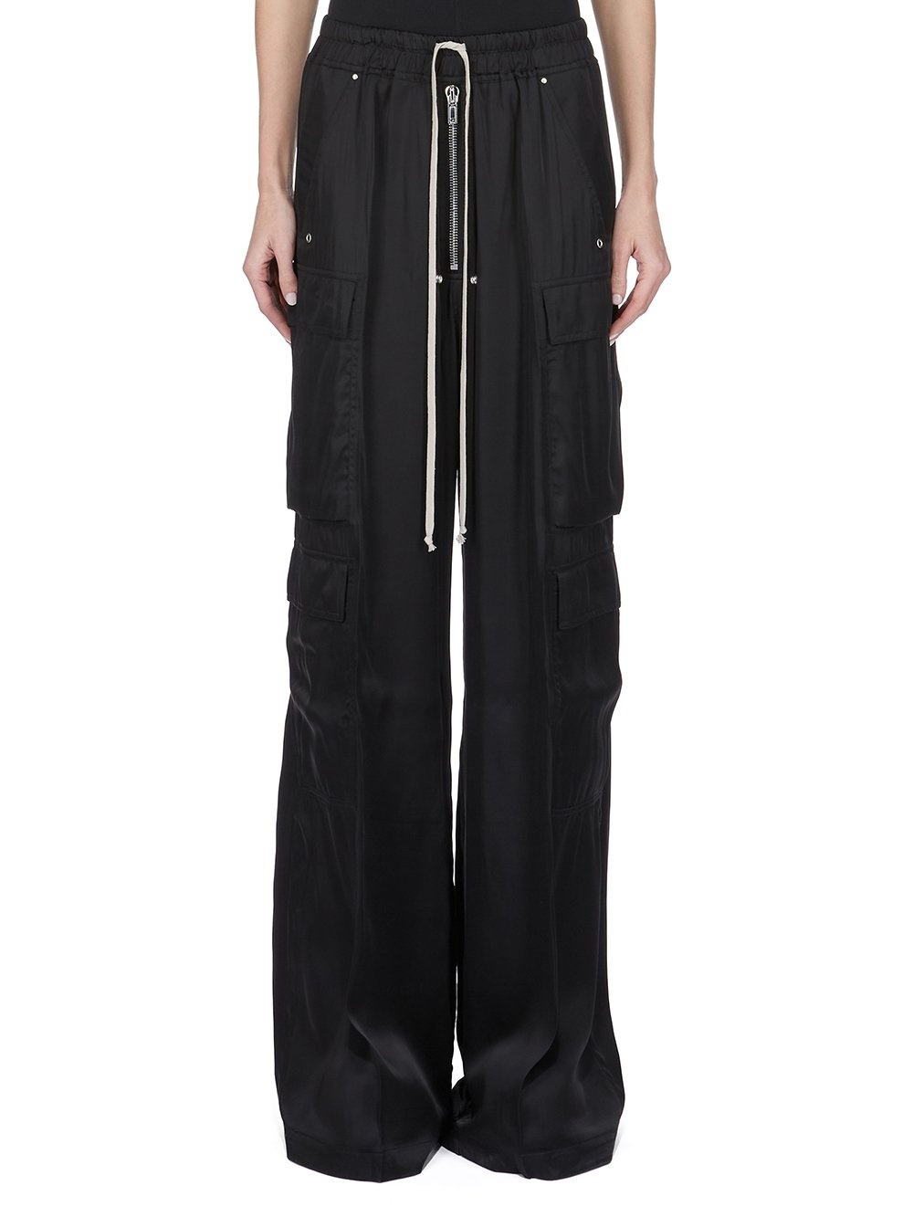 RICK OWENS SS25 HOLLYWOOD CARGOBELAS PANTS IN BLACK WASHED CHARMEUSE THESE CARGOBELAS PANTS ARE FULL-LENGTH WITH A LOW CROTCH AND WIDE LEG. THEY FEATURE AN ELASTICIZED WAISTBAND WITH DRAWSTRING AND A BELA EXPOSED CENTER ZIPPER WITH TWO SNAP DETAIL AT BOTTOM THEY HAVE SIDE WELT POCKETS WITH RIVET AND EYELET DETAIL, FOUR BEVELED CARGO POCKETS ON THE SIDE LEG AND TWO REAR WELT POCKETS WITH CONCEALED SNAPS AND TOPSTITCHING THIS LIGHTWEIGHT AND FLUID CHARMEUSE HAS A SEMI-SHINY SURFACE AND WASHED FINISH.THIS FABRIC IS MADE FROM CERTIFIED VISCOSE WHICH ENSURES THAT THE FIBERS ARE PRODUCED FROM RESPONSIBLY MANAGED SOURCES AND NO DEFORESTATION OCCURS COLOR: BLACK MATERIAL: 61% ACETATE + 39% VISCOSE MODEL IS 181CM TALL MODEL WEARS SIZE 40