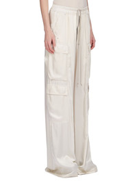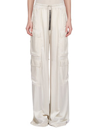 RICK OWENS SS25 HOLLYWOOD CARGOBELAS IN DINGE WASHED CHARMEUSE THESE CARGOBELAS PANTS ARE FULL-LENGTH WITH A LOW CROTCH AND WIDE LEG. THEY FEATURE AN ELASTICIZED WAISTBAND WITH DRAWSTRING AND A BELA EXPOSED CENTER ZIPPER WITH TWO SNAP DETAIL AT BOTTOM. THEY HAVE SIDE WELT POCKETS WITH RIVET AND EYELET DETAIL, FOUR BEVELED CARGO POCKETS ON THE SIDE LEG AND TWO REAR WELT POCKETS WITH CONCEALED SNAPS AND TOPSTITCHING THIS LIGHTWEIGHT AND FLUID CHARMEUSE IS HAS A SEMI-SHINY SURFACE AND WASHED FINISH. THIS FABRIC IS MADE FROM CERTIFIED VISCOSE WHICH ENSURES THAT THE FIBERS ARE PRODUCED FROM RESPONSIBLY MANAGED SOURCES AND NO DEFORESTATION OCCURS COLOR: DINGE MATERIAL: 61% ACETATE + + 39% VISCOSE MODEL IS 181CM TALL MODEL WEARS SIZE 40