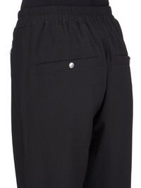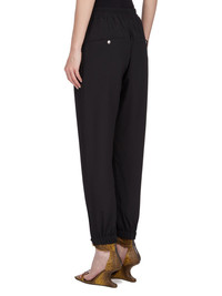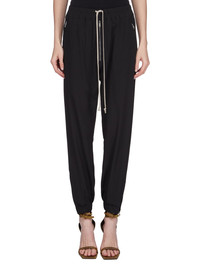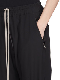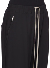 RICK OWENS SS25 HOLLYWOOD TRACK IN BLACK COCOON CREPE THESE TRACK PANTS ARE FULL-LENGTH WITH A SLIGHTLY DROPPED CROTCH. THEY HAVE AN ELASTICIZED WAISTBAND WITH DRAWSTRING, AN EXPOSED ZIPPER FLY, TWO SIDE JET POCKETS WITH ZIPS, TWO BACK WELT POCKETS WITH SNAPS, AND ELASTICIZED HEMS WITH ZIPPER OPENINGS ON THE OUTER ANKLES THIS LIGHTWEIGHT AND FLUID SILK BLEND CREPE HAS A DRY AND MATTE FINISH.THIS FABRIC IS MADE FROM FSC® - CERTIFIED (FSC - C162846) ACETATE WHICH ENSURES THAT THE FIBERS ARE PRODUCED FROM RESPONSIBLY MANAGED SOURCES AND NO DEFORESTATION OCCURS COLOR: BLACK MATERIAL: 64% ACETATE + 36% SILKMODEL IS 181CM TALL MODEL WEARS SIZE 40