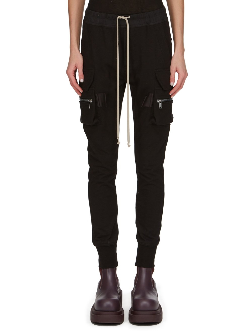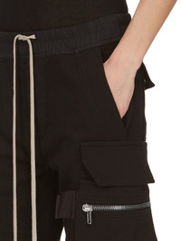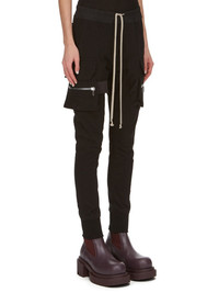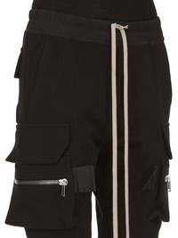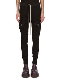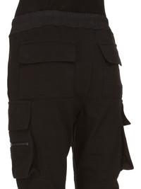 RICK OWENS FW23 LUXOR MASTODON CARGO IN HEAVY JERSEY THESE MASTODON CARGO PANTS ARE FULL LENGTH WITH A SLIM FIT AND AN ELASTICIZED WAIST WITH DRAWSTRING. THEY FEATURE TWO SIDE POCKETS, PLUS TWO ZIPPERED CARGO PANNIER POCKETS WITH FLAPS AND TABS ON THE OUTER THIGH. THEY HAVE TWO BACK POCKETS WITH FLAPS AND ELASTICATED ANKLES THIS HEAVYWEIGHT JERSEY IS COMPACT WITH A DRY HANDFEEL. THIS JERSEY IS MADE USING GOTS CERTIFIED ORGANIC COTTON WHICH MEANS THE NATURAL FIBER IS GROWN WITHOUT HARMFUL CHEMICALS, LEAVING OUR SOIL, AIR AND WATER CLEANER FROM CONTAMINATES - COLOR: BLACK - MATERIAL: 100% COTTON - BAND 97% COTTON + 3% ELASTANE - MODEL IS WEARING SIZE 40 - MODEL IS 181 CM TALL