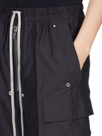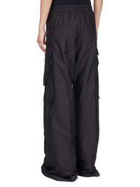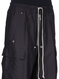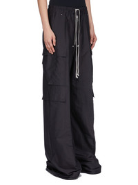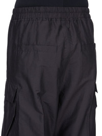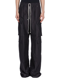 RICK OWENS SS26 TEMPLE CARGOBELAS IN BLACK COTTON SILK POPLIN THESE CARGOBELAS PANTS ARE FULL-LENGTH WITH A LOW CROTCH AND WIDE LEG. THEY FEATURE AN ELASTICIZED WAISTBAND WITH DRAWSTRING AND A BELA EXPOSED CENTER ZIPPER WITH TWO SNAP DETAIL AT BOTTOM. THEY HAVE SIDE WELT POCKETS WITH RIVET AND EYELET DETAIL, FOUR BEVELED CARGO POCKETS ON THE SIDE LEG AND TWO REAR WELT POCKETS WITH CONCEALED SNAPS AND TOPSTITCHING THIS LIGHTWEIGHT COTTON AND SILK BLEND POPLIN HAS A WASHED FINISH. IT IS WOVEN IN THE COMO REGION OF ITALY KNOWN FOR ITS HERITAGE OF SILK PRODUCTION THIS FABRIC IS MADE USING GOTS CERTIFIED ORGANIC COTTON WHICH MEANS THE NATURAL FIBRE IS GROWN WITHOUT HARMFUL CHEMICALS, LEAVING OUR SOIL, AIR AND WATER CLEANER FROM CONTAMINATES COLOR: BLACK MATERIAL:89% COTTON + 11% SILK MODEL IS 181CM TALL MODEL WEARS SIZE 40