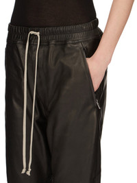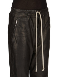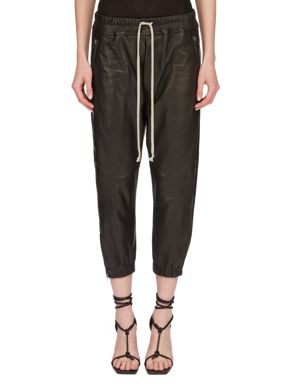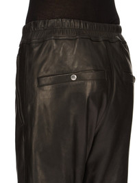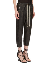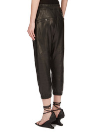RICK OWENS SS24 LIDO CROPPED TRACK IN BLACK VEG NAPPA LAMB THESE CROPPED TRACK PANTS ARE MID-CALF LENGTH WITH A SLIM JOGGER FIT. THEY HAVE AN ELASTICIZED WAISTBAND WITH DRAWSTRING. THEY HAVE A CONCEALED FLY, SIDE FRONT JET POCKETS WITH ZIPPERS, BACK WELT POCKETS WITH BUTTONS, ELASTICATED ANKLES WITH A ZIPPER OPENING ON THE OUTER ANKLE THIS MEDIUMWEIGHT LAMB LEATHER IS VEG TANNED AND FINISHED USING NATURAL WAXES AND ANILINE WHICH MAKES A SUPPLE HANDFEEL. BECAUSE THIS SKIN IS NAKED, NOT FINISHED USING ANY PIGMENTS COVERING THE SKIN, NATURAL MARKINGS AND SHADINGS ARE VISIBLE WHICH MAKES EACH SKIN AND PRODUCT UNIQUE. VEG TANNING MEANS ONLY VEGETAL AND NATURAL TANNINS WERE USED IN THE PROCESS OF TANNING AND PRESERVING THIS LEATHER. - COLOR: BLACK - MATERIAL: 100% LAMB LEATHER - LINING 100% CUPRO - BUTTONS 100% BUFFALO HORN - MODEL IS 181CM TALL - MODEL WEARS SIZE 40