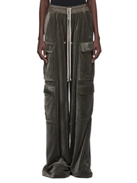 RICK OWENS FW25 CONCORDIANS CARGOBELAS PANTS IN BOSCO VELVET THESE CARGOBELAS PANTS ARE FULL-LENGTH WITH A LOW CROTCH AND WIDE LEG. THEY FEATURE AN ELASTICIZED WAISTBAND WITH DRAWSTRING AND A BELA EXPOSED CENTER ZIPPER WITH TWO SNAP DETAIL AT BOTTOM. THEY HAVE SIDE WELT POCKETS WITH RIVET AND EYELET DETAIL, FOUR BEVELED CARGO POCKETS ON THE SIDE LEG AND TWO REAR WELT POCKETS WITH CONCEALED SNAPS AND TOPSTITCHING THIS LIGHTWEIGHT AND FLUID VELVET HAS A SOFT AND WASHED UNEVEN FINISH. THIS FABRIC IS MADE FROM CERTIFIED VISCOSE WHICH ENSURES THAT THE FIBERS ARE PRODUCED FROM RESPONSIBLY MANAGED SOURCES AND NO DEFORESTATION OCCURS COLOR: BOSCO MATERIAL: 82% VISCOSE + 18% SILK BAND 100% CUPRO MODEL IS 181CM TALL MODEL WEARS SIZE 40