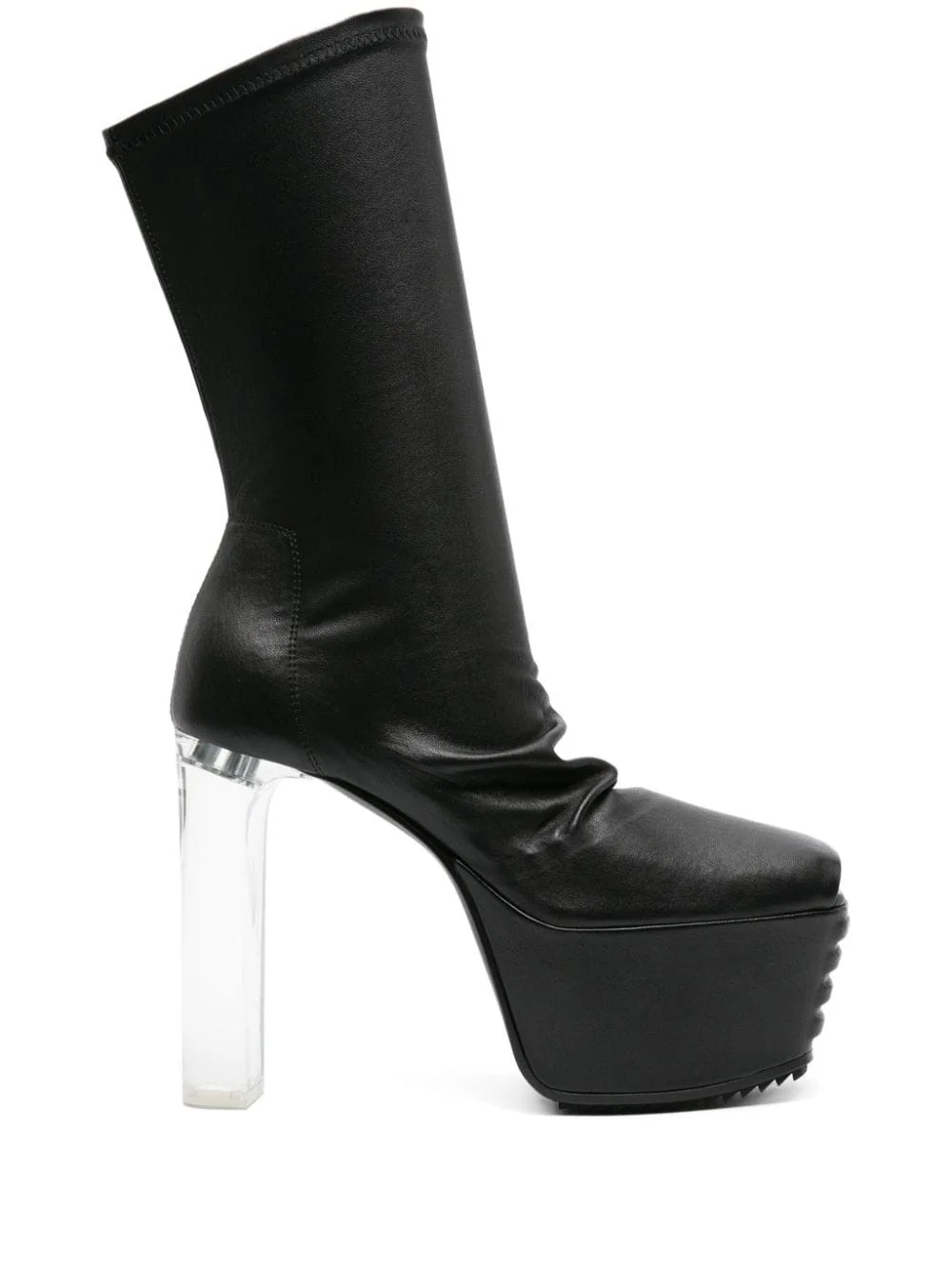 peep-toe leather mid-calf boots Highlights - Black - Calf leather - Smooth grain - Peep toe - Mid-calf length - 210mm high block heel - Transparent block heel - 70mm platform sole - Branded leather insole Made in Italy Composition Outer: Calf Leather 100% Lining: Calf Leather 100% Sole: Calf Leather 100%, Rubber 100% SIZE & FIT Measurement HEEL 5.31 in(13.5 cm) HEIGHT 8.26 in(21 cm) PLATFORM 2.75 in(7 cm)