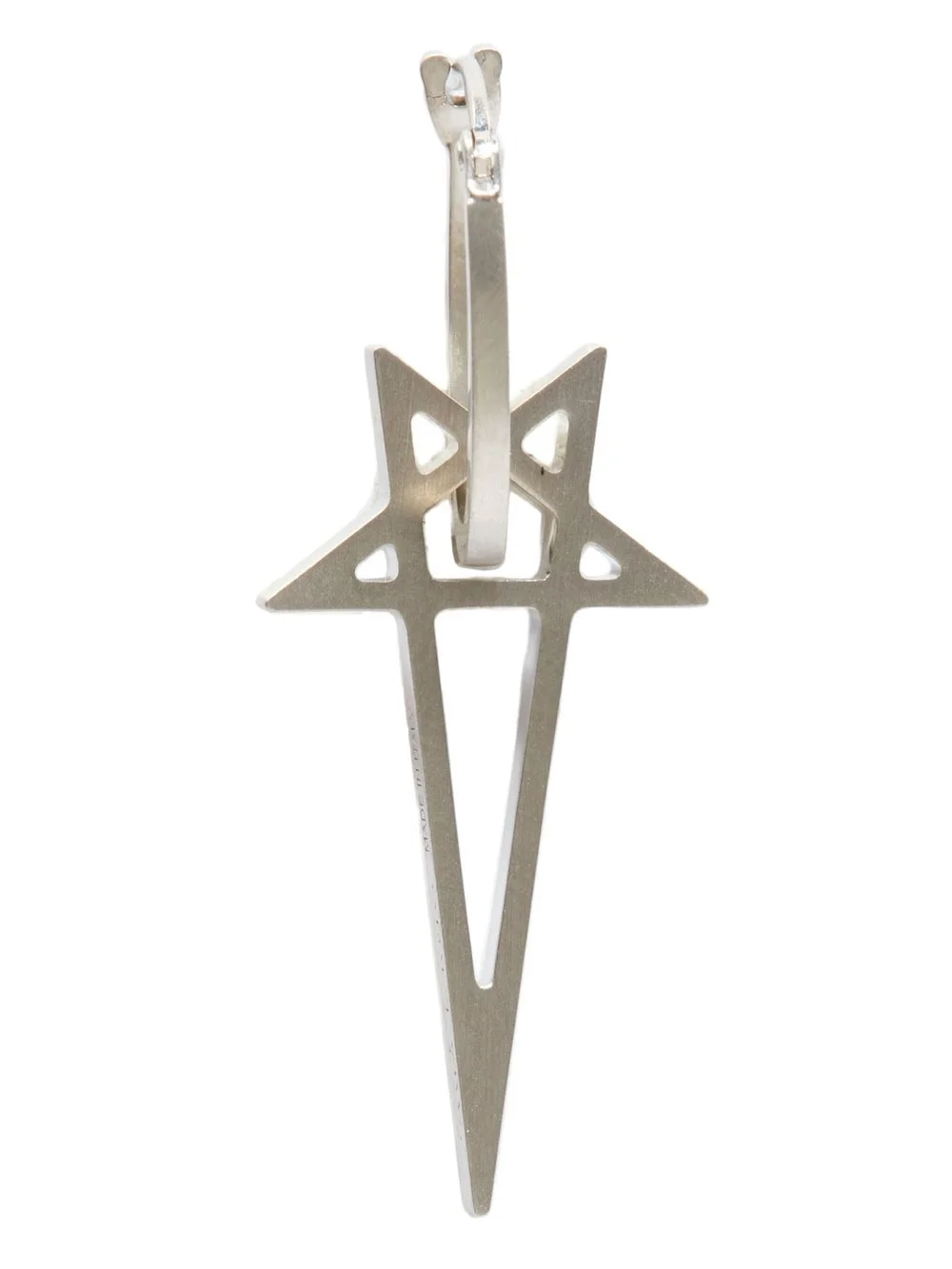 RICK OWENS FW24 PORTERVILLE PENTAGRAM EARRING IN PALLADIO BRASS THIS PENTAGRAM EARRING HAS A SMALL PENTAGRAM HANGING FROM AN OVAL SHAPED EARRING. IT HAS THE RICK OWENS LOGO ENGRAVED ON THE SIDE FACE. THIS JEWELRY PIECE HAS A SEMI-SHINY BRUSHED PALLADIUM FINISH - COLOR: PALLADIO - MATERIAL: 100% SILVER METAL - CHARM LENGTH 3CM / EARRING LENGTH 4CM AVAILABLE IN ONE SIZE