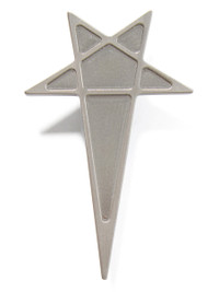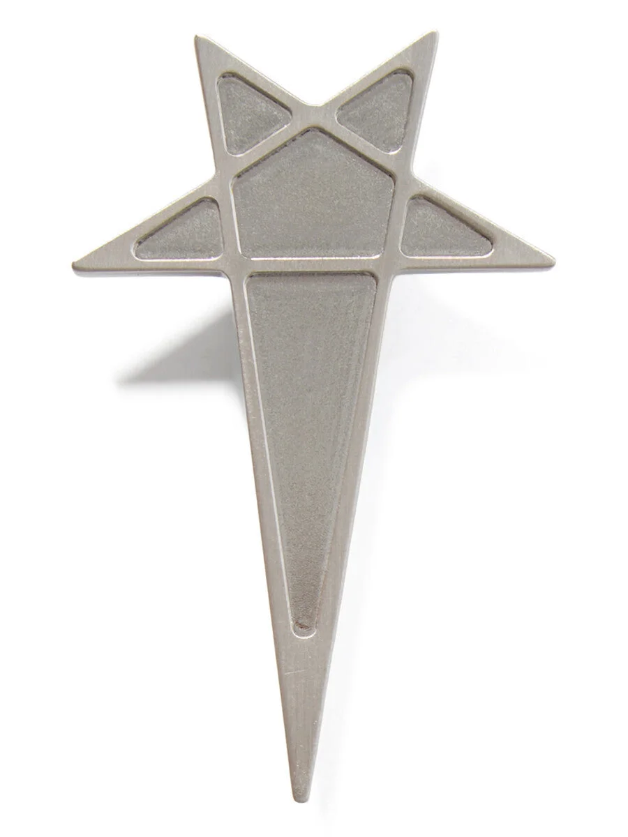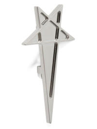 RICK OWENS SS26 TEMPLE RUNWAY PENTAGRAM LAPEL PIN IN BRASS THIS PENTAGRAM LAPEL PIN IS PENTAGRAM SHAPED AND HAS A CLASSIC PIN SYSTEM AT BACK, TO ENABLE IT TO BE PINNED TO GARMENTS. IT IS INSPIRED BY THE STAR PIN WORN BY ALAN VEGA ON HIS LEATHER JACKET LAPEL. THIS JEWELRY PIECE HAS A SEMI-SHINY BRUSHED PALLADIUM FINISH. COLOR: PALLADIUM MATERIAL: 100% BRASS