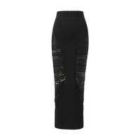 Rick Owens's Pillar Skirt in Black, this floor-length, form-fitting skirt is made from wool. Featuring a ribbed waistband, tapered silhouette, and a back slit extending up to the knee, it also has a signature knit seam along the centre back. A timeless piece that combines comfort and style. - Composition: 100% New Wool - Ribbed waistband for added comfort - Back slit for ease of movement - Signature knit seam along the center back - Floor-length fit - Made in Italy Model is 175 cm and wears size S. SKU: RO01E7679 KGRIDM 09