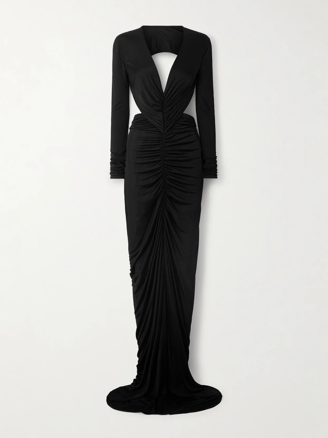 Rick Owens' 'Poppy' gown is the epitome of understated glamour. Made from jersey, it's ruched through the front to accentuate your figure and has a deep V-neckline and alluring open-back. Show off the leg-baring split in photos.