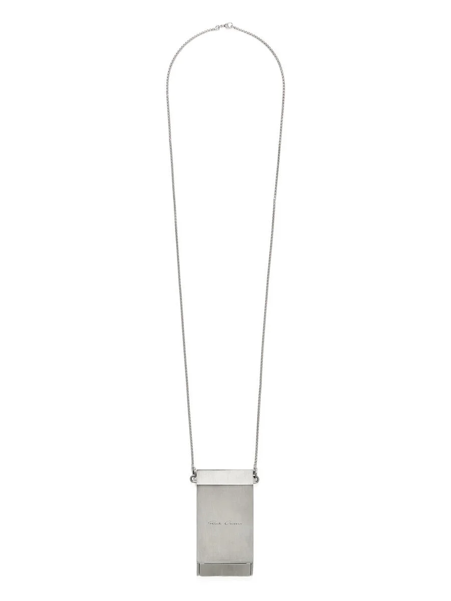 RICK OWENS SS26 TEMPLE RUNWAY PORTABLE ASHTRAY NECKLACE IN BRASS THIS PORTABLE ASHTRAY CHARM HANGS FROM A NECK CHAIN AND HAS A SLIDING MECHANISM TO OPEN AND CLOSE IT. THIS JEWELRY PIECE HAS A SEMI-SHINY BRUSHED PALLADIUM FINISH. COLOR: PALLADIUM MATERIAL: 100% BRASS