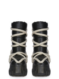 RICK OWENS FW24 PORTERVILLE LUNAR MEGA TRACTOR IN BLACK/BLACK PEACHED LAMB SKIN THESE LUNAR MEGA TRACTOR ARE ABOVE-ANKLE HEIGHT. THEY HAVE A SOFT PADDED PULL ON BOOT UPPER AND A DOUBLE-HEIGHT MEGA TRACTOR SOLE. THEY ARE CRISS-CROSSED WITH JUMBO PENTA LACING THIS LIGHTWEIGHT LAMB LEATHER HAS A SOFT AND NATURAL HANDFEEL ACHIEVED BY TUMBLING THE SKINS MULTIPLE TIMES IN A LARGE DRUM. - COLOR: BLACK/BLACK - MATERIAL: UPPER 100% LAMB LEATHER - LEG LINING 100% NYLON - UPPER LINING 100% CALF LEATHER - PADDING 100% POLYESTER - INSOLE 100% CALF LEATHER - SOLE 100% E.V.A