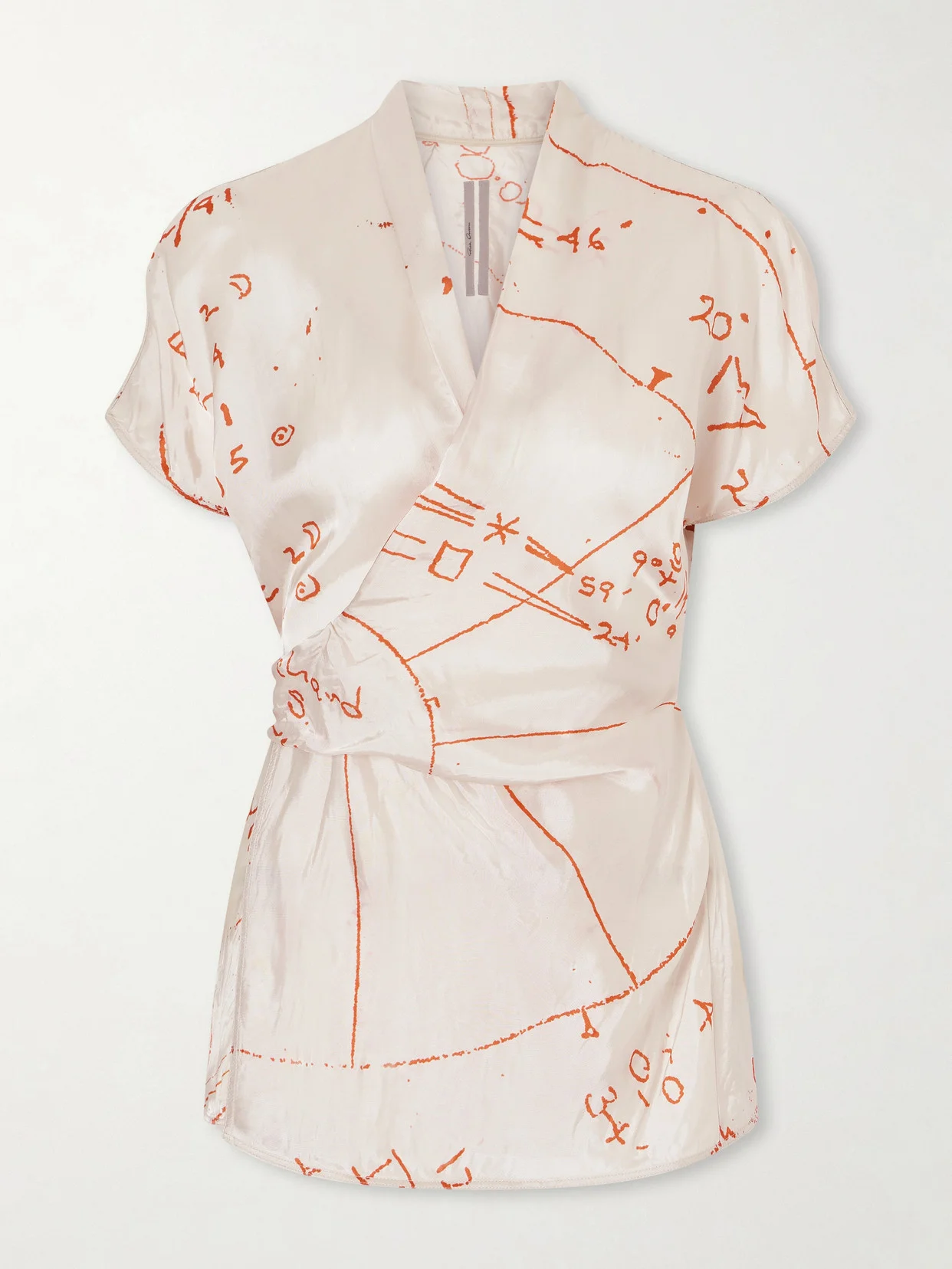 Printed with the designer's astrological chart, Rick Owens' top tells the story of a fashion legacy written in the stars. It's cut from fluid satin-twill and has an elegant wrap front. Double up with the matching shorts in our edit.