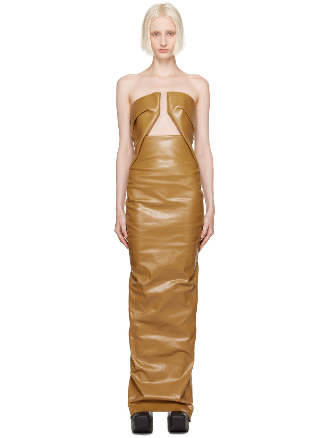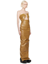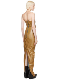 Coated stretch denim dress. · Modified straight neck · Pleats and underwire at cups · Cutout at front · Raw edge at hem · Zip closure at back · Central vent at back hem · Partial stretch cotton canvas lining Supplier color: Honey
