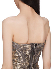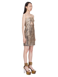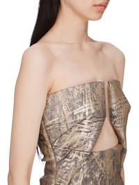RICK OWENS SS25 HOLLYWOOD PRONG MINI IN GOLD MEGACRUST STRETCH DENIM THIS PRONG MINI IS MID-THIGH LENGTH. IT FEATURES A STRAPLESS RUCHED BODY GATHERING INTO THE BUST, WHICH FEATURES A BONED GEOMETRIC CUT OUT FRONT AND A TIGHT FITTING SKIRT THIS LIGHTWEIGHT GOLD MEGACRUST STRETCH DENIM IS MADE ON A 10OZ BLACK AND NATURAL STRETCH DENIM. THE READY GARMENT IS OVERDYED DUST AND THEN TREATED WITH LAYERS OF GOLD COLORED FOIL THAT IS PRESSED ON BY HAND. THE NATURAL ASPECTS OF THIS TREATMENT MEANS THE FOIL APPLICATION IS IRREGULAR AND HAS PEELED OFF AND CRACKED IN CERTAIN AREAS AND WILL CONTINUE TO DO SO WITH WEAR AND ABRASION. THIS IS AN INHERENT CHARACTERISTIC OF THIS TYPE OF TREATMENT AND IS A DESIRED A VISUAL ASPECT WHICH ADDS TO THE UNIQUENESS OF EACH PIECE. THIS GARMENT IS TREATED IN AN ITALIAN WASH HOUSE BASED IN THE VENETO AREA OF ITALY, THAT PRODUCES IN SMALLER TREATMENT BATHS TO REDUCE WATER WASTE AND UTILIZE A WATER PURIFYING PROCESS THAT ENABLES THEM TO RECYCLE A PORTION OF THE WATER USED. ALL OF OUR DENIM WASHES ARE ZDHC CERTIFIED COLOR: GOLD MATERIAL: 93% COTTON + 6% POLYESTER + 1% ELASTANE MODEL IS 181CM TALL MODEL WEARS SIZE 38