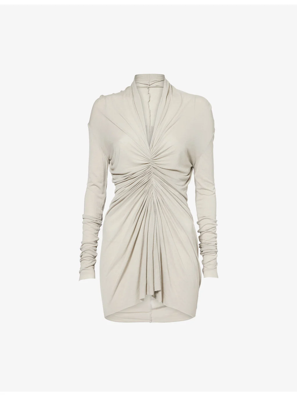 PRODUCT DETAILS - Rick Owens woven top - 88% viscose, 12% silk - Slim fit, V-neck, long sleeves, gathered at front, raw trims - Hand wash cold - Made in Italy - Model is 5ft 10in/1.78m and wears a size UK 8 - Lightweight, stretchy Ref: R04583818