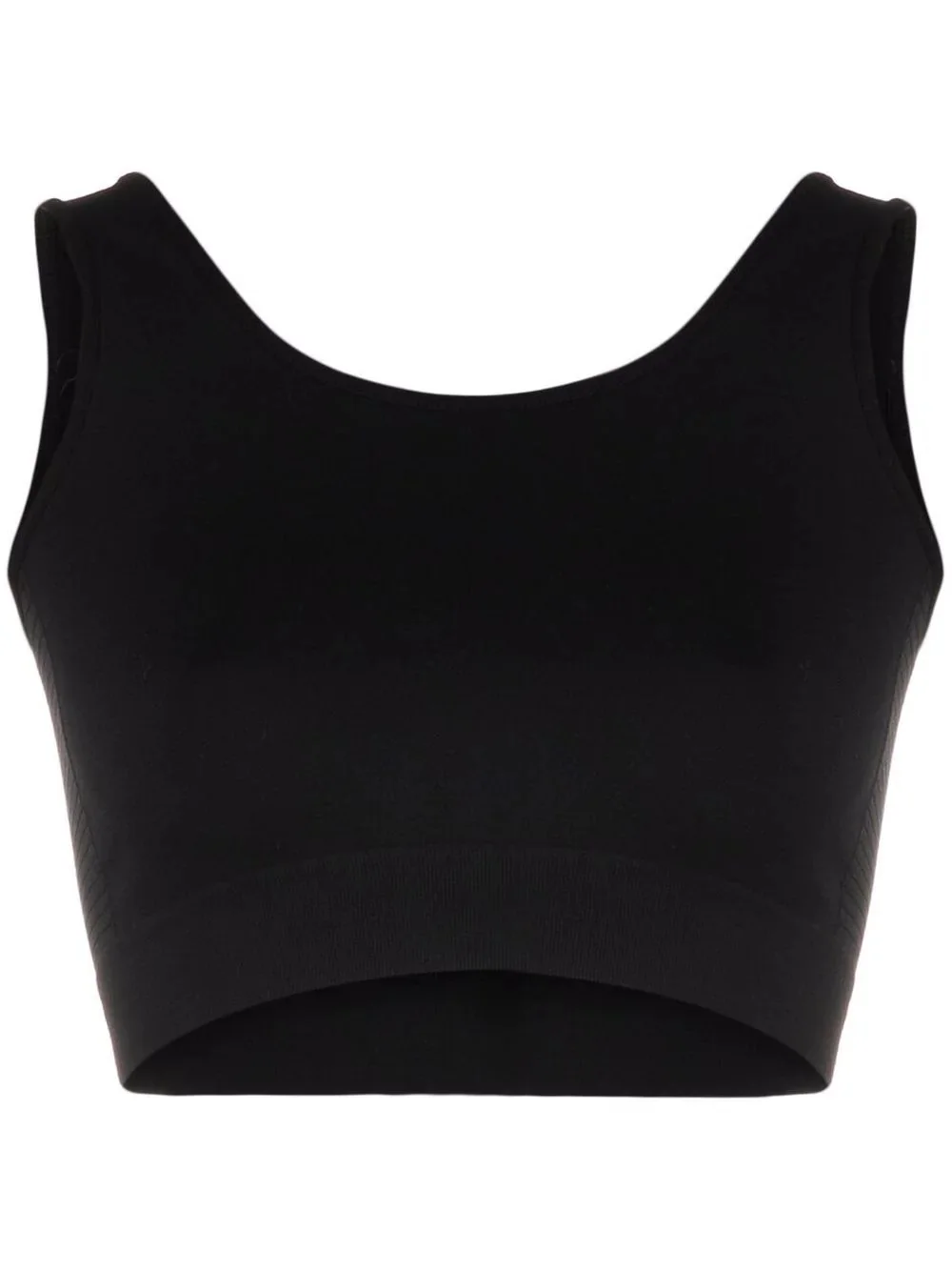 ribbed scoop-neck sports bra Highlights - Black - Stretch-design - Ribbed detailing - Scoop neck - Sleeveless - Elasticated underband - Cropped Made in Italy Composition Polyester 95%, Elastane 5% SIZE & FIT Model measurements Height 5 ft 10 in(1.78 m) Bust/Chest 33.07 in(84 cm) Hips 35.82 in(91 cm) Waist 25.98 in(66 cm) FittingInformation This piece fits true to size. We recommend you get your regular size Cut for a close fit Made with a mid-weight stretch fabric Washing instructions Hand Wash