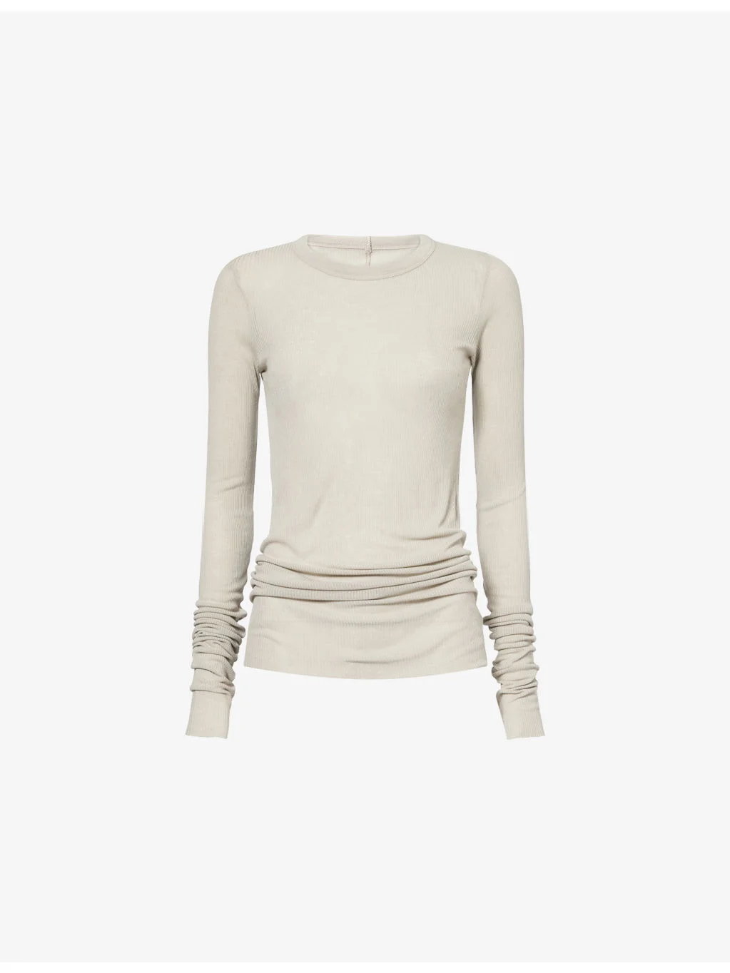 PRODUCT DETAILS - Rick Owens knitted T-shirt - 88% viscose, 12% silk - Slim fit, round-neck, long sleeves, semi-sheer, all-over knitted and ribbed, raw trims - Hand wash cold - Made in Italy - True to size - Model is 5ft 10in/1.78m and wears a size UK 8 - Lightweight, stretchy Ref: R04583819